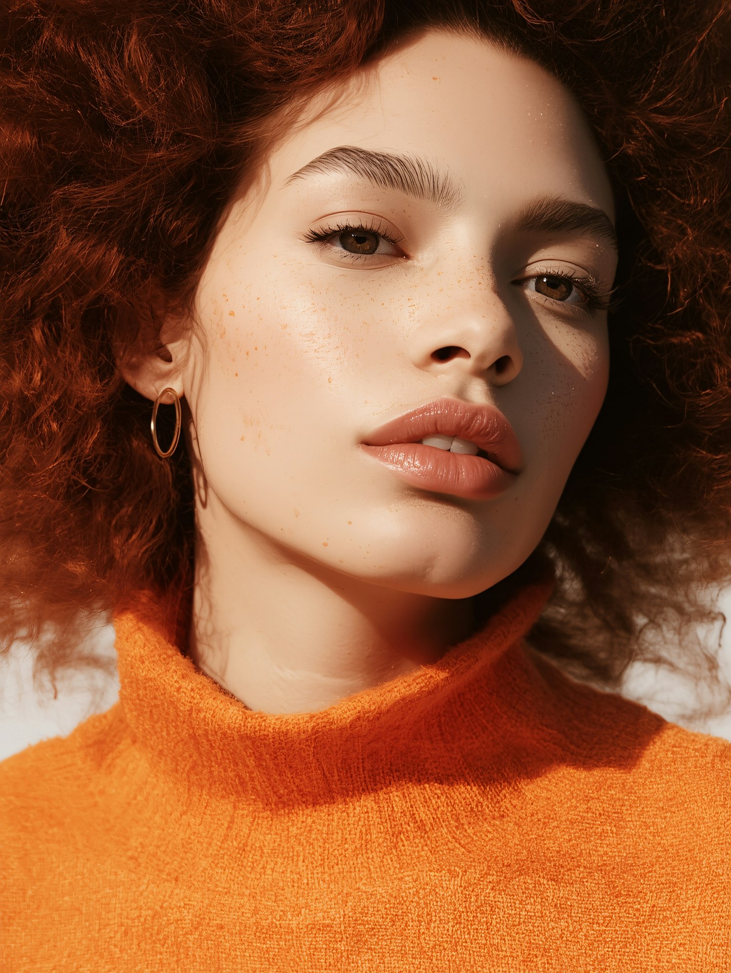 Close-up of a woman with red curly hair, freckles, and an orange turtleneck, showcasing natural beauty and warm tones.