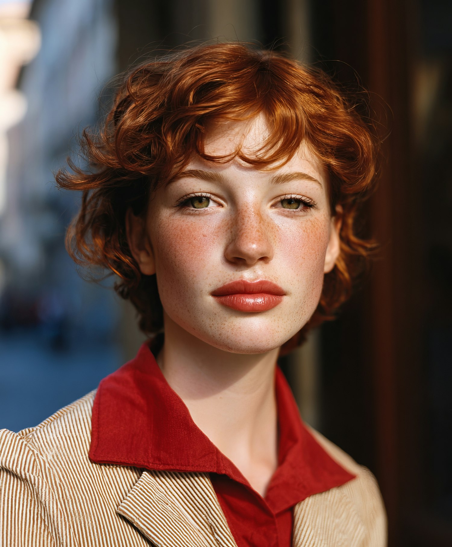 Portrait of a young woman with red hair, freckles, and green eyes, wearing a red shirt and beige blazer in a softly lit urban setting.