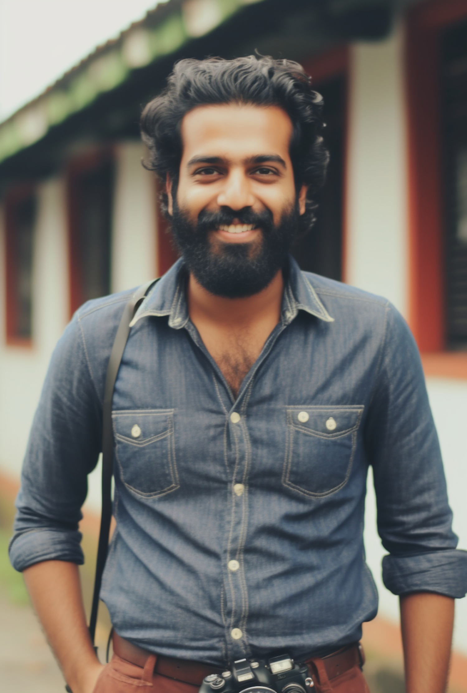 Smiling man with a beard and camera, wearing a denim shirt outdoors. Casual and friendly vibe with blurred building background.