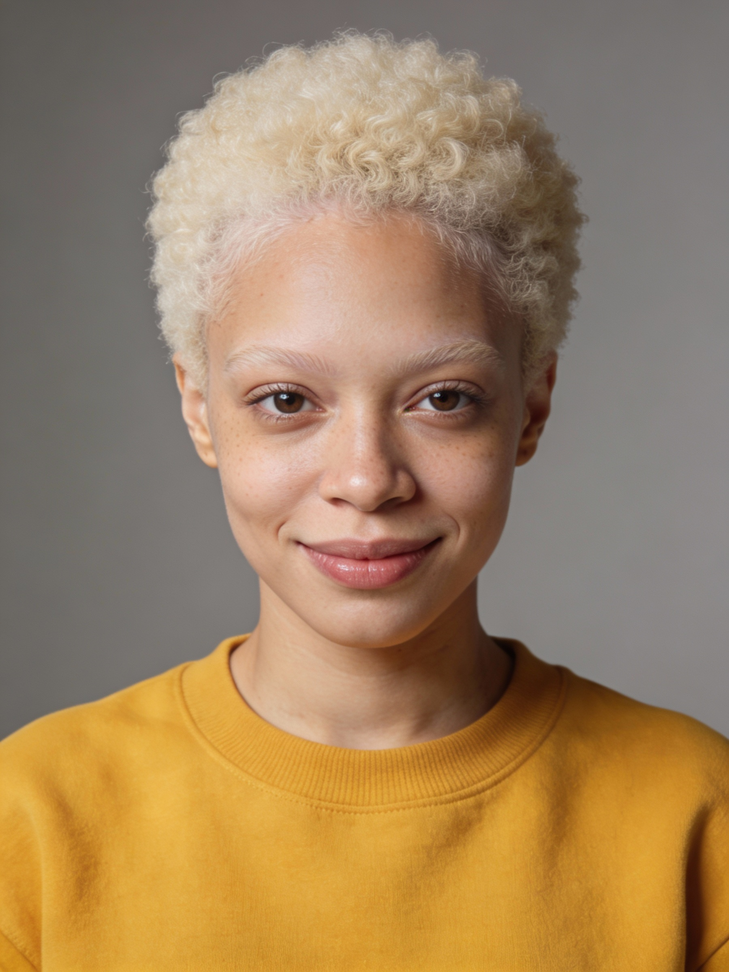 Studio portrait of a Nigerian female in her late 20s with albinism; very light skin with warm undertone; short rounded platinum-blonde afro, naturally textured; bold mustard-yellow crewneck sweater, no logos; neutral mid-gray seamless backdrop; Rembrandt lighting with soft fill; 105 mm macro-sharp. Expression: calm and self-assured, gentle closed-mouth smile. Framing: portrait orientation, 3:4 ratio; mid-chest-up composition, subject centered at eye level, facing directly toward the camera (front view). Full head and hair fully inside the frame with a little space above; both shoulders visible, no cropping at the top or sides.