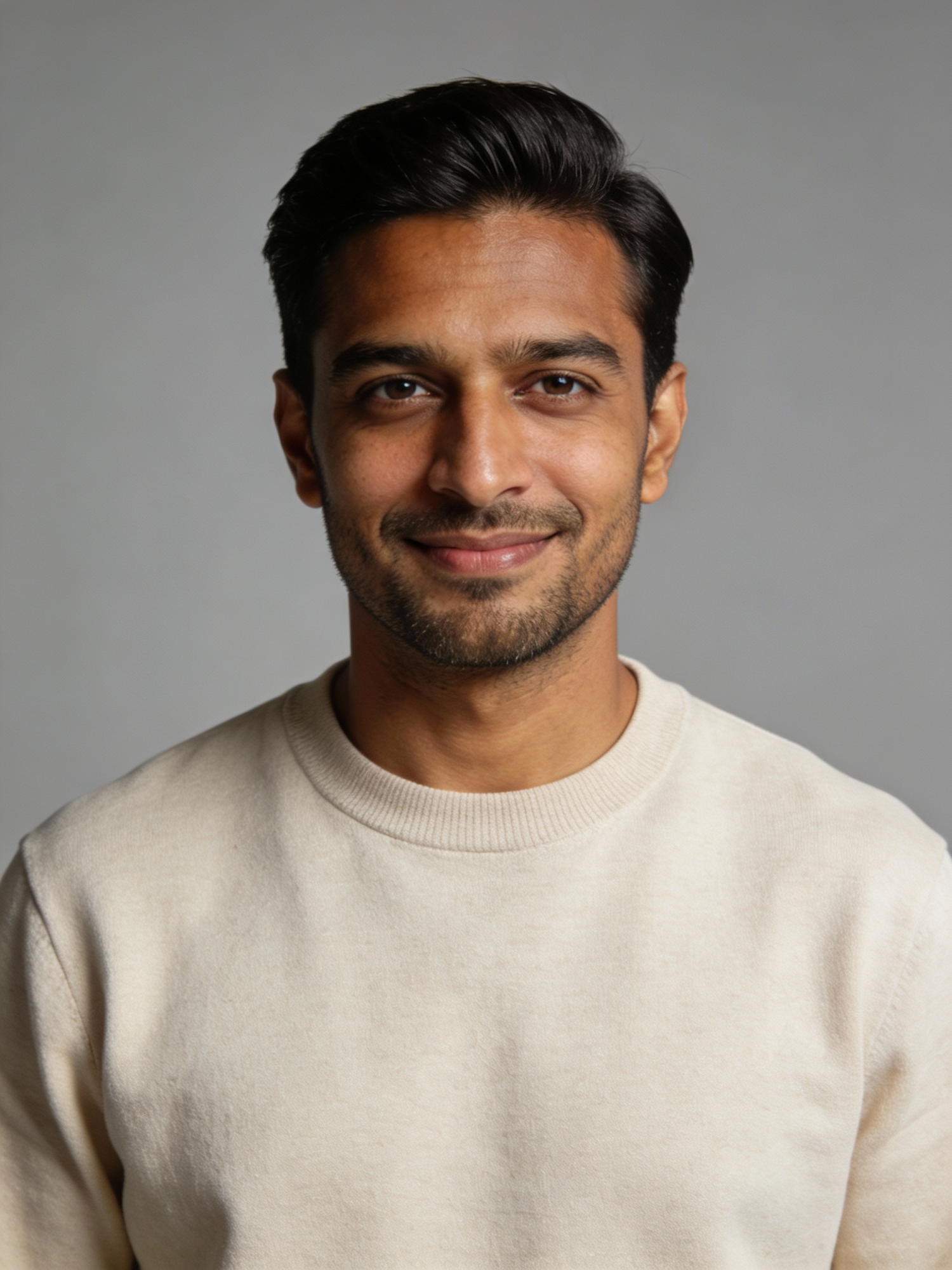 Studio portrait of an Indian male in his mid 30s; medium brown skin, neutral undertone; short black hair, neatly combed; trimmed stubble; simple light beige crewneck sweater, no logos; neutral mid-gray seamless backdrop; Rembrandt lighting with soft fill; 105 mm macro-sharp. Expression: relaxed after work, small closed-mouth smile. Framing: portrait orientation, 3:4 ratio; mid-chest-up composition. Subject centered in frame, camera at eye level, facing directly toward the camera (front view). Full head and hair completely inside the frame with a little space above; both shoulders visible, no cropping at the top or sides. Neutral studio composition, no props.