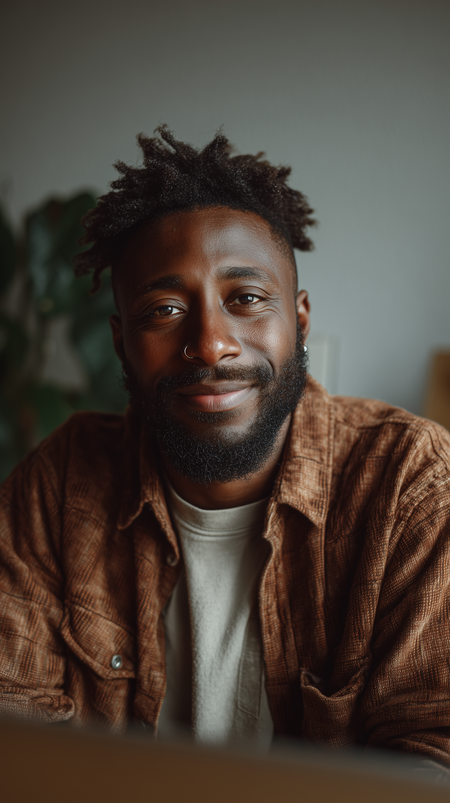 A man with a warm smile, wearing a brown shirt and light t-shirt, sits in a softly lit room with a blurred background.