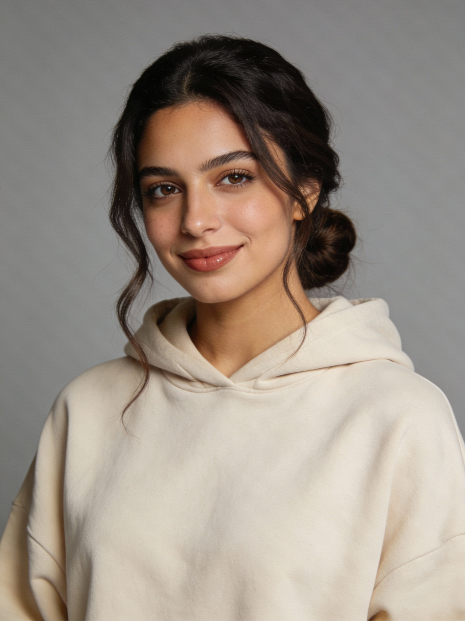 Studio portrait of a Lebanese female in her late 20s; light olive skin, warm undertone; long dark hair in a loose low bun with a few strands framing her face; relaxed oversized beige hoodie, no logos; minimal natural makeup; neutral mid-gray seamless backdrop; Rembrandt lighting with soft fill; 105 mm macro-sharp. Expression: cozy and calm, gentle closed-mouth smile.