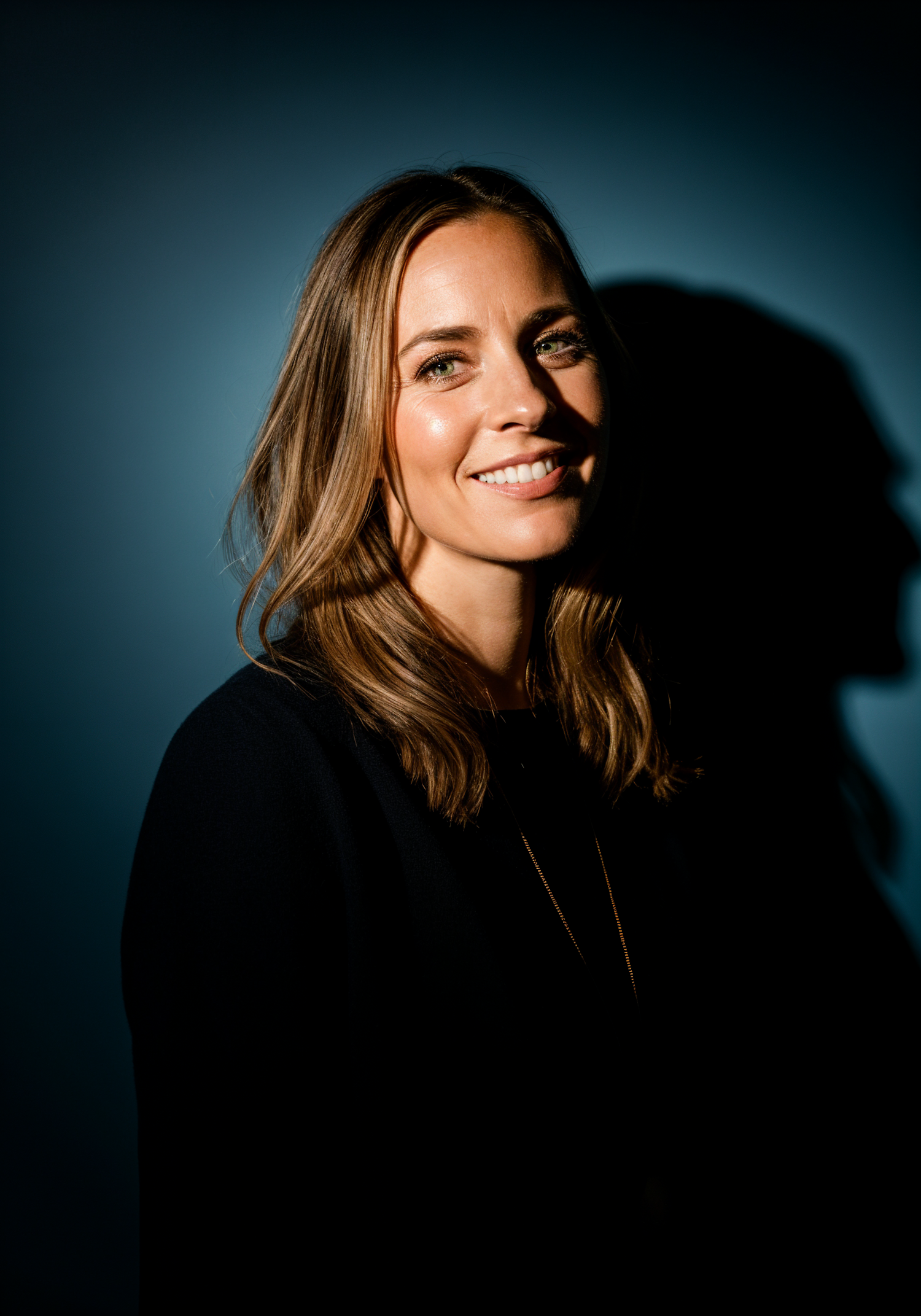 A woman with light brown hair and green eyes smiles warmly in a dramatic portrait with a dark blue background and soft shadows.