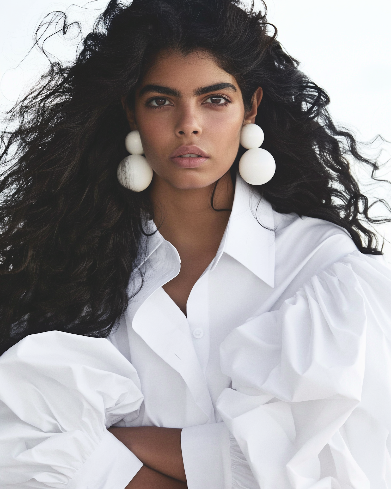 Portrait of a woman with voluminous curly hair, bold white earrings, and a dramatic puff-sleeve white shirt against a soft background.