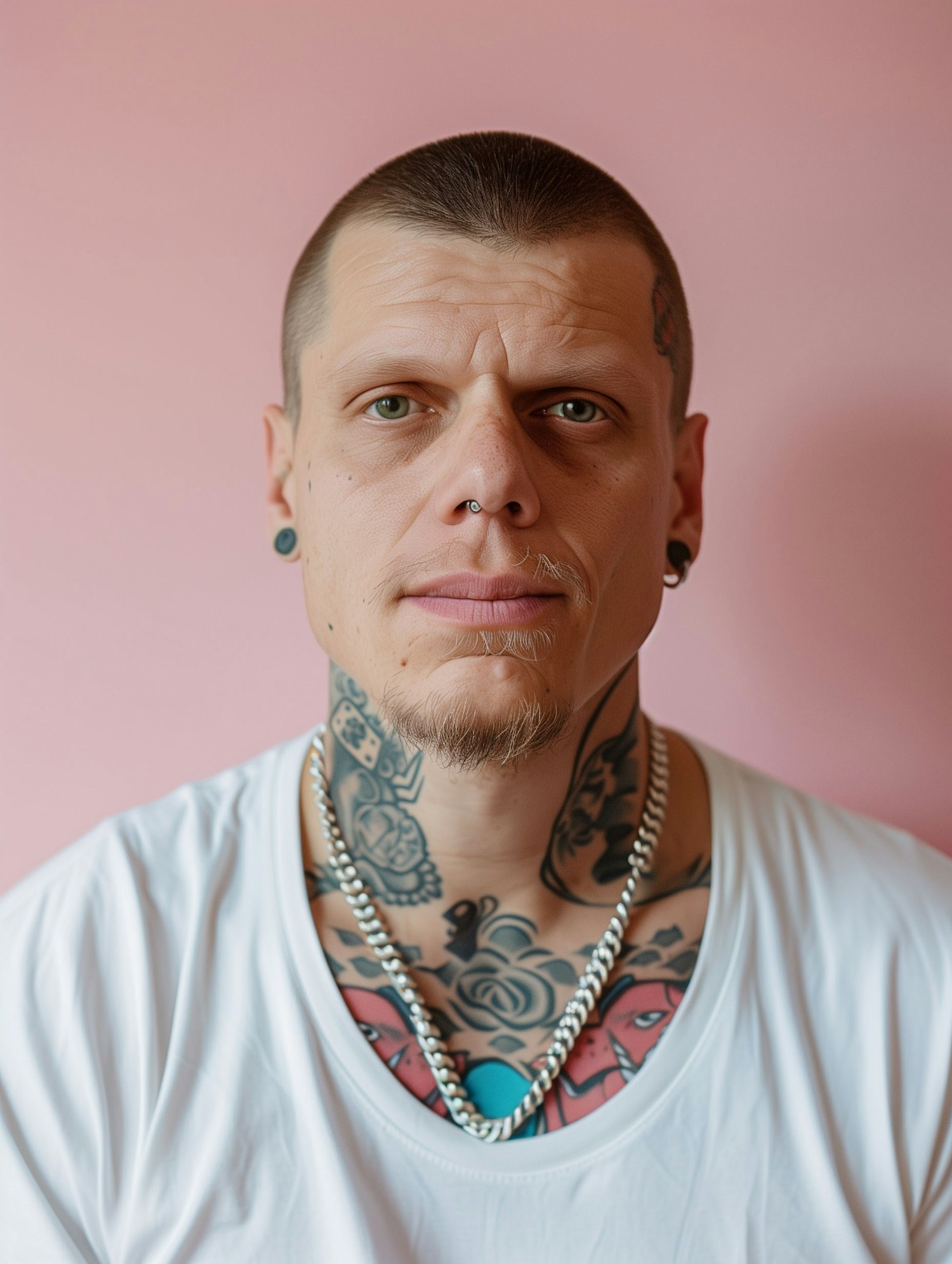 Portrait of a tattooed man with a shaved head, piercings, and a neutral expression against a pink background.