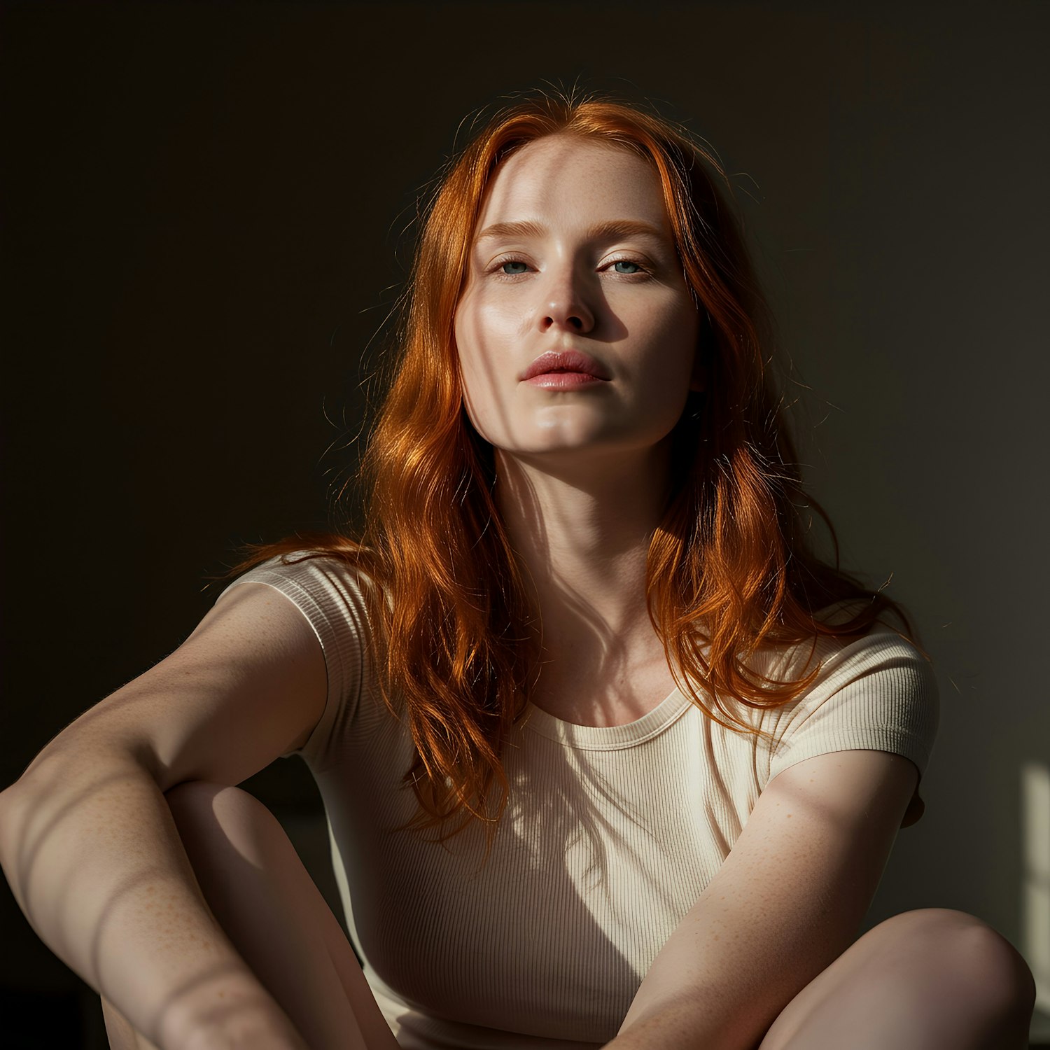 Portrait of a fair-skinned woman with ginger hair, wearing a light top, illuminated by soft sunlight against a dark backdrop.