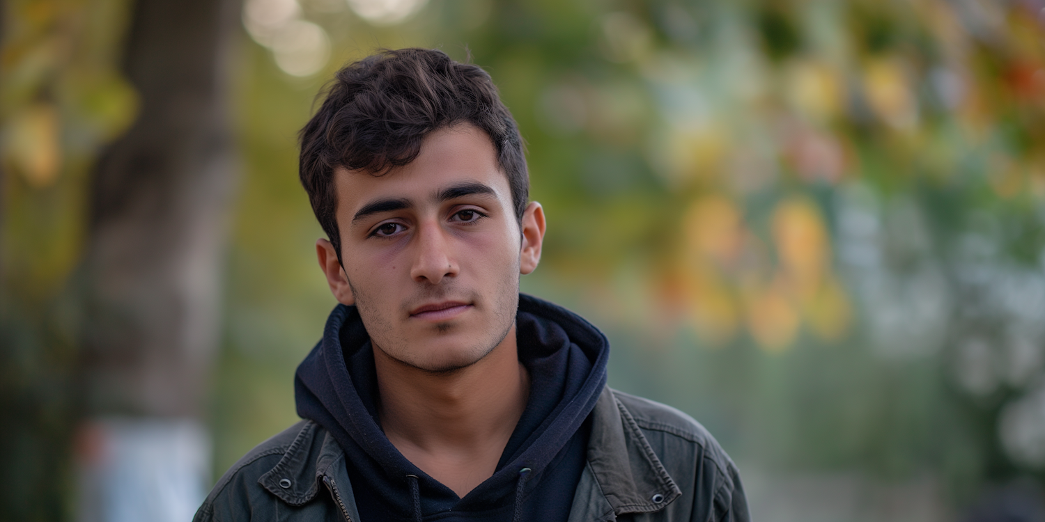 Young man with dark hair and neutral expression in an autumn setting, wearing a hoodie and green jacket. Soft, blurred background.