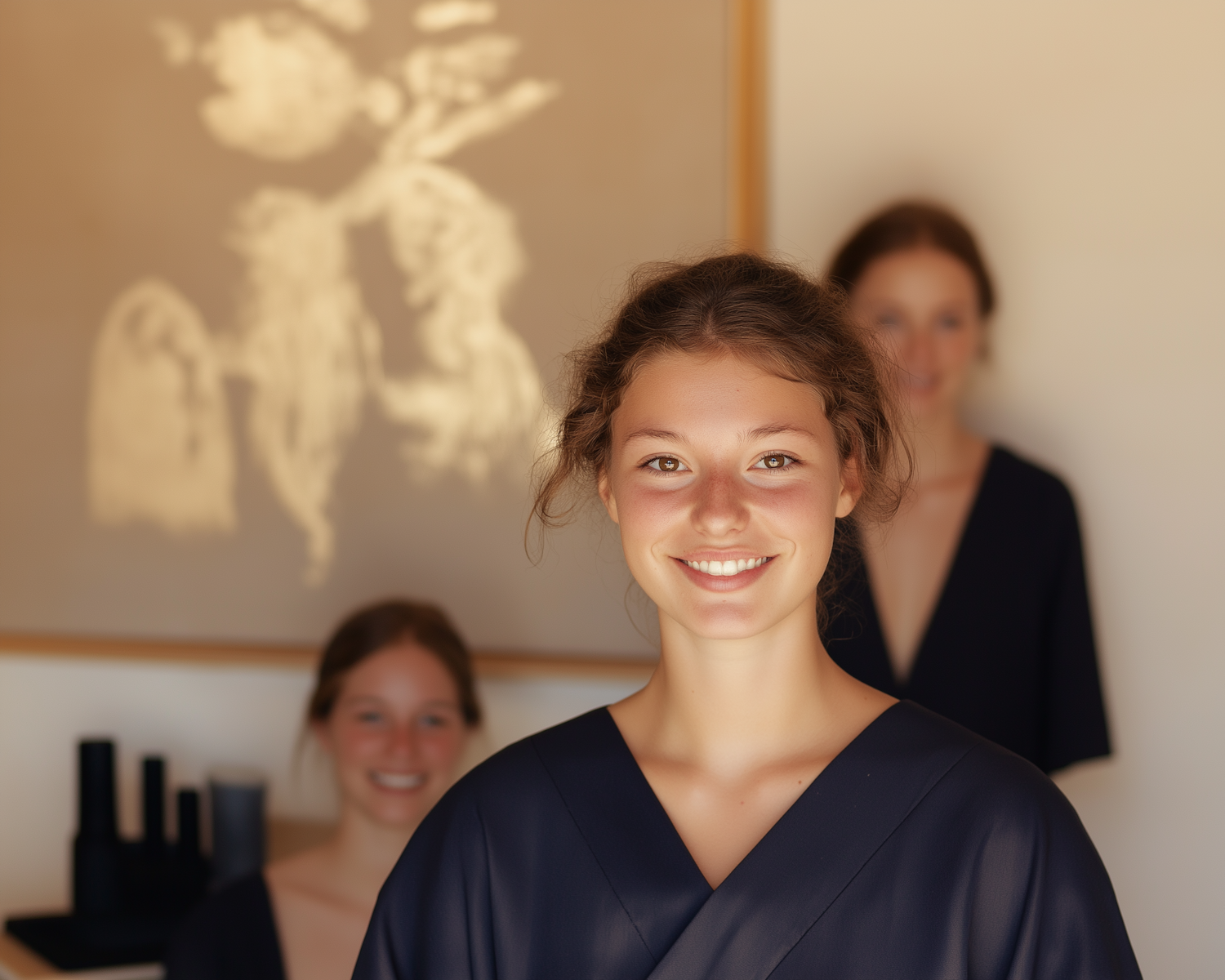Three women in dark blue tops, with one smiling in focus, create a warm and harmonious scene with soft lighting and artistic background.