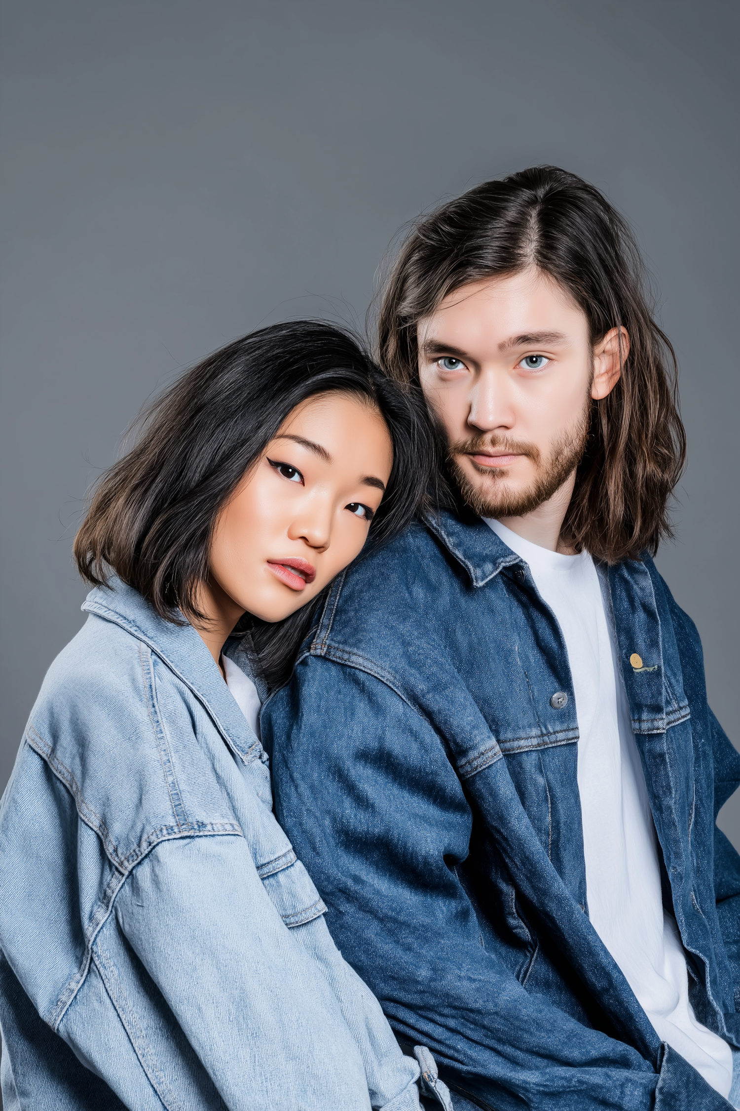 A close-up portrait of a man and woman in denim jackets, posing together against a gray background.