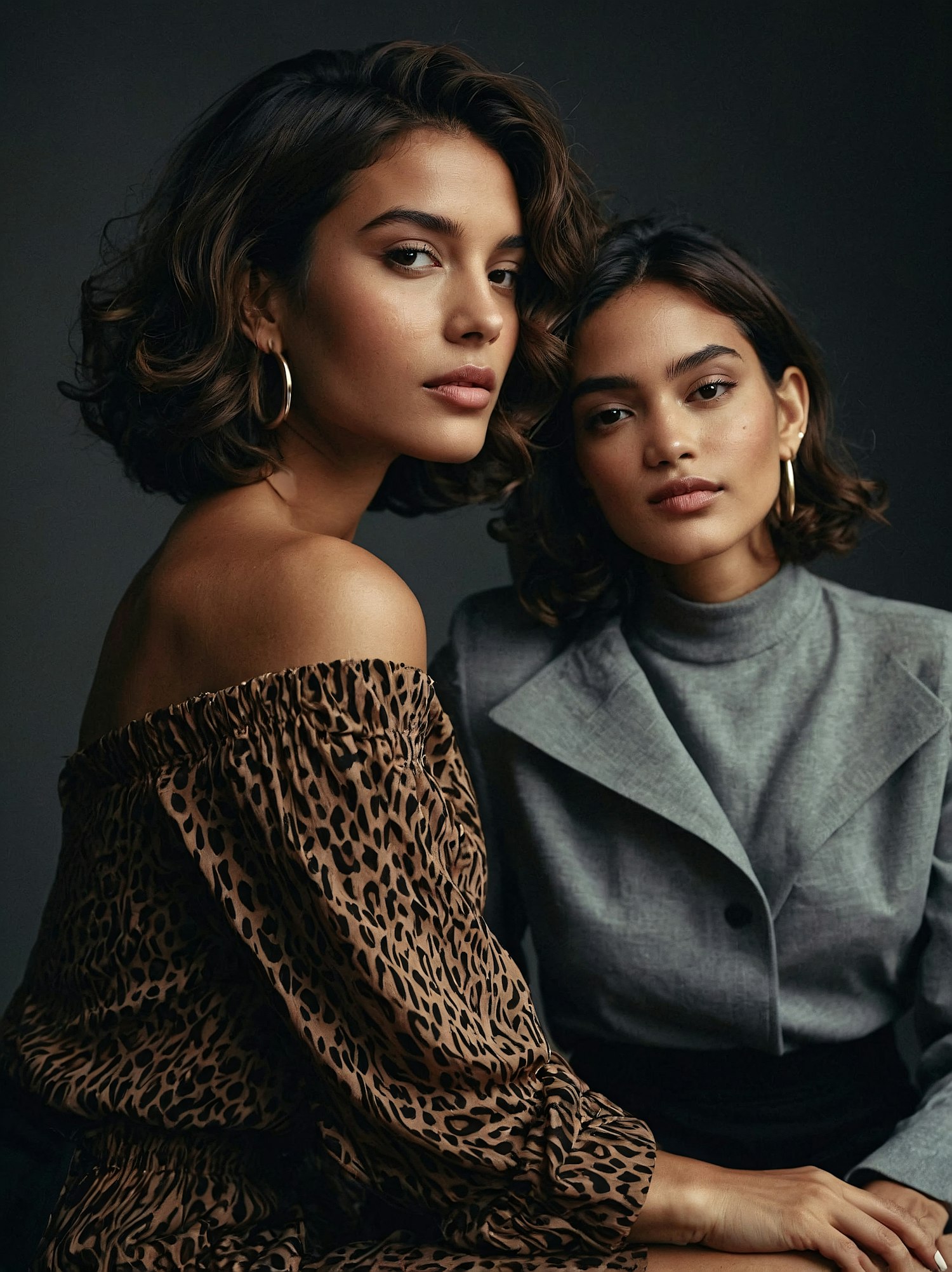 Two women with dark hair and hoop earrings pose elegantly in leopard print and gray blazer against a dark background.