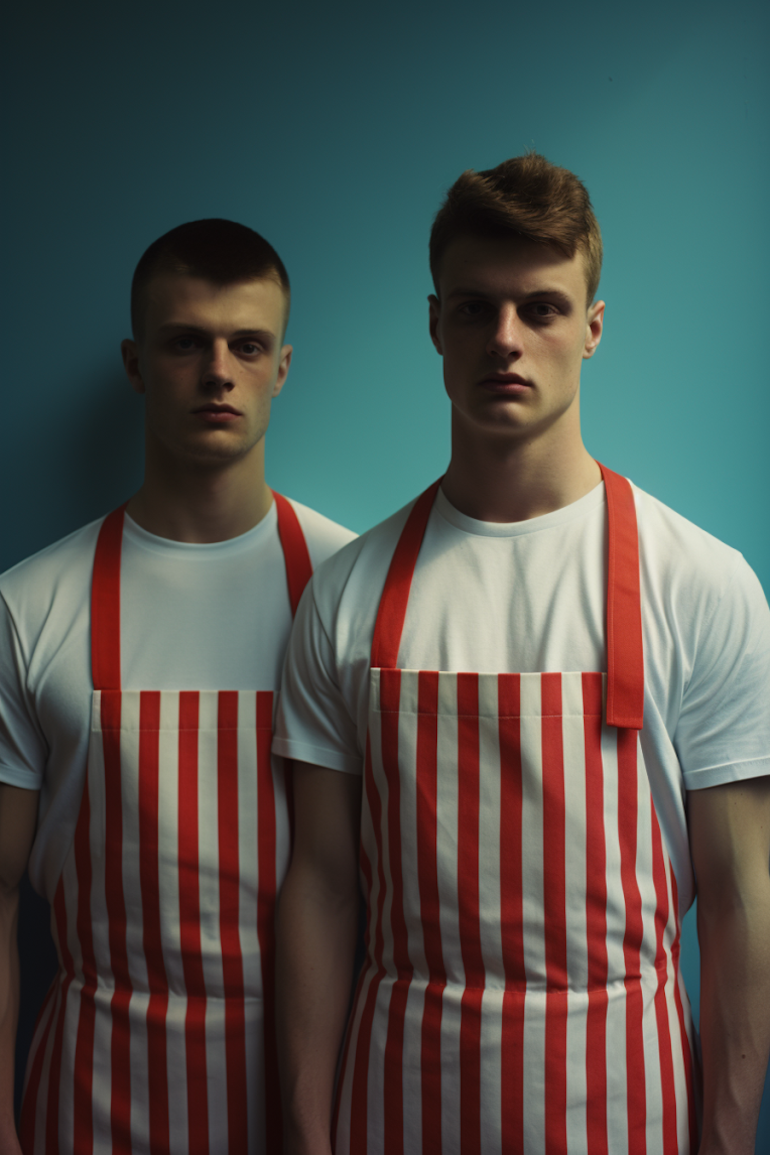Two young men in red and white striped aprons stand against a teal background, exuding a sense of camaraderie.