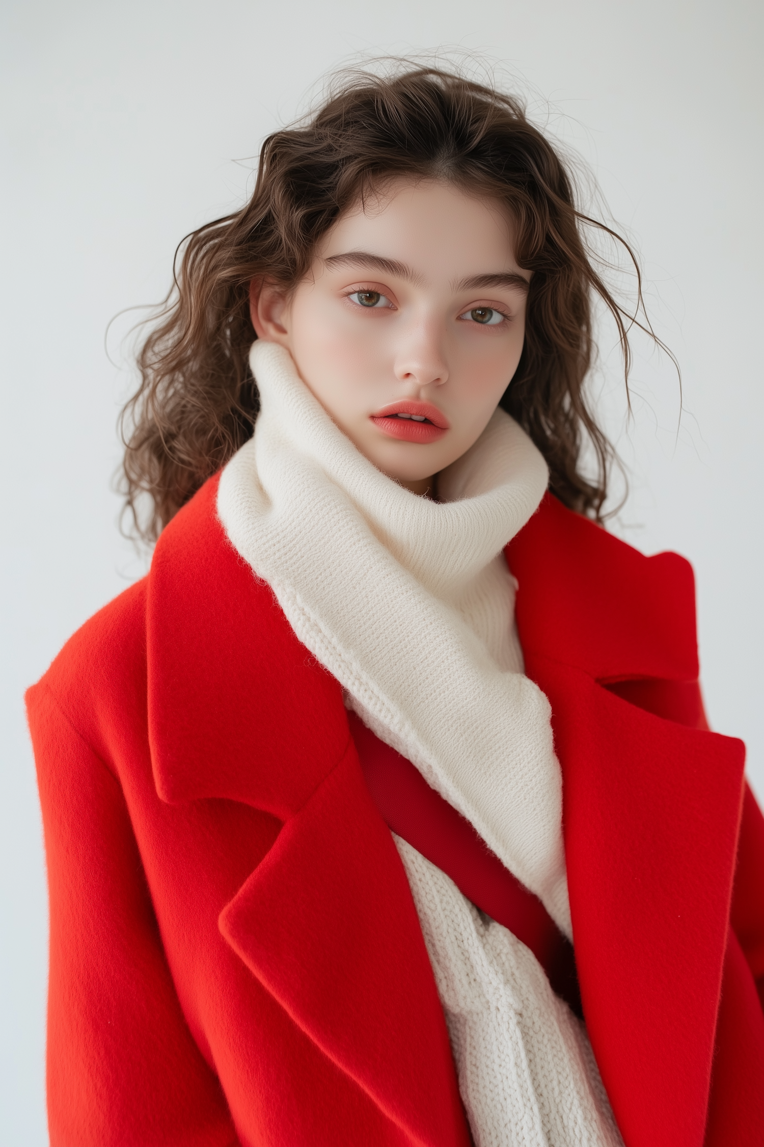 Stylish woman in a red coat and cream scarf, with wavy brown hair and light green eyes, posing against a minimal background.