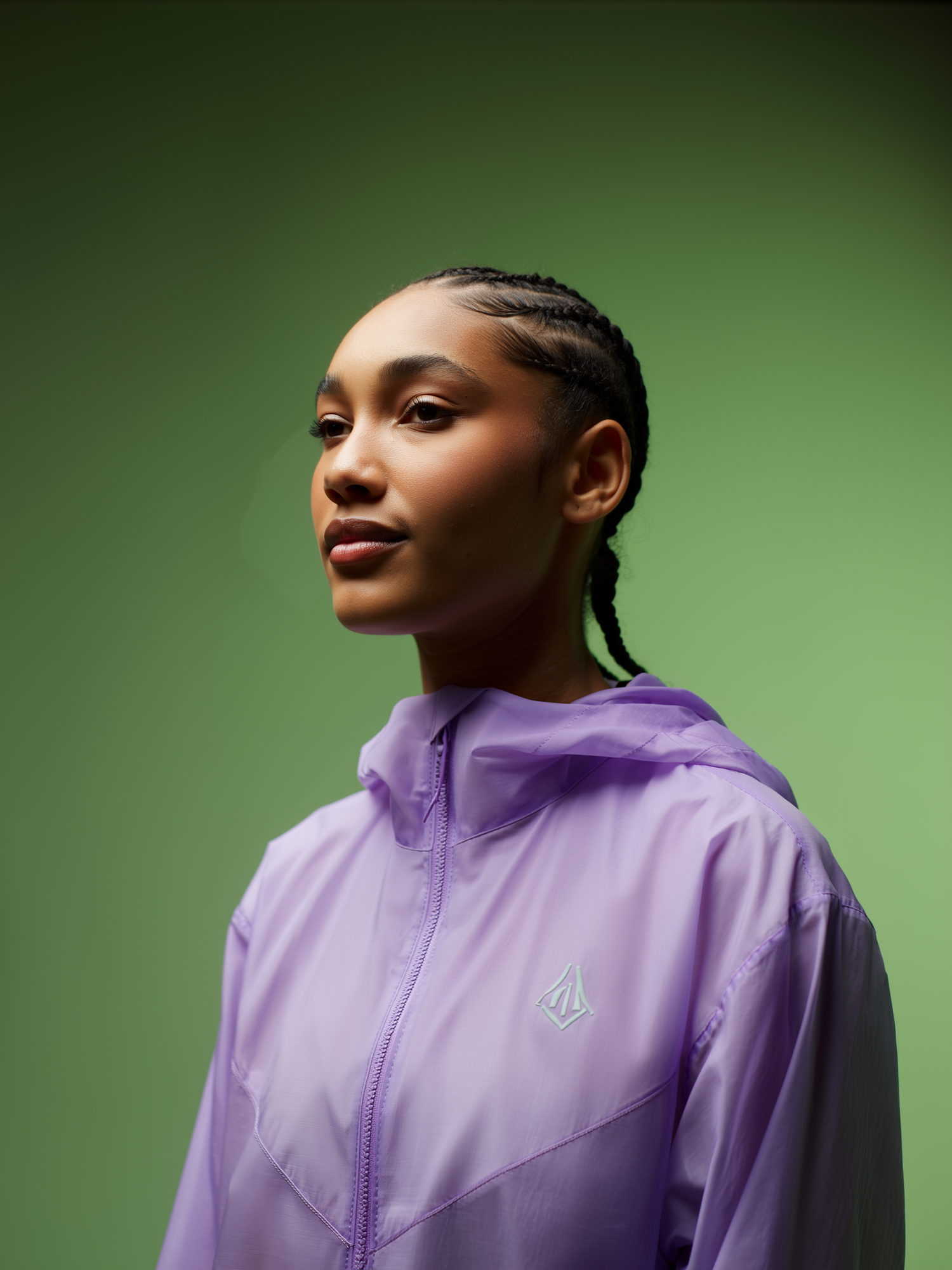 Stylish portrait of a woman in a light purple jacket against a green background, showcasing modern fashion and clean aesthetics.