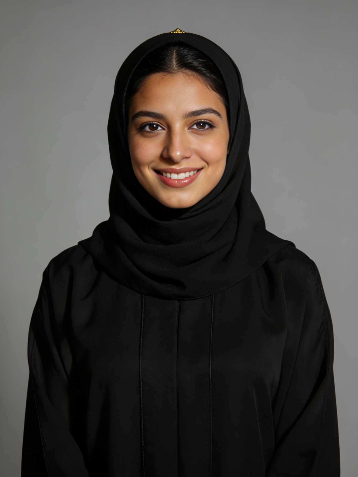 A woman in a black hijab smiles warmly against a neutral background, her expression radiating kindness and confidence.
