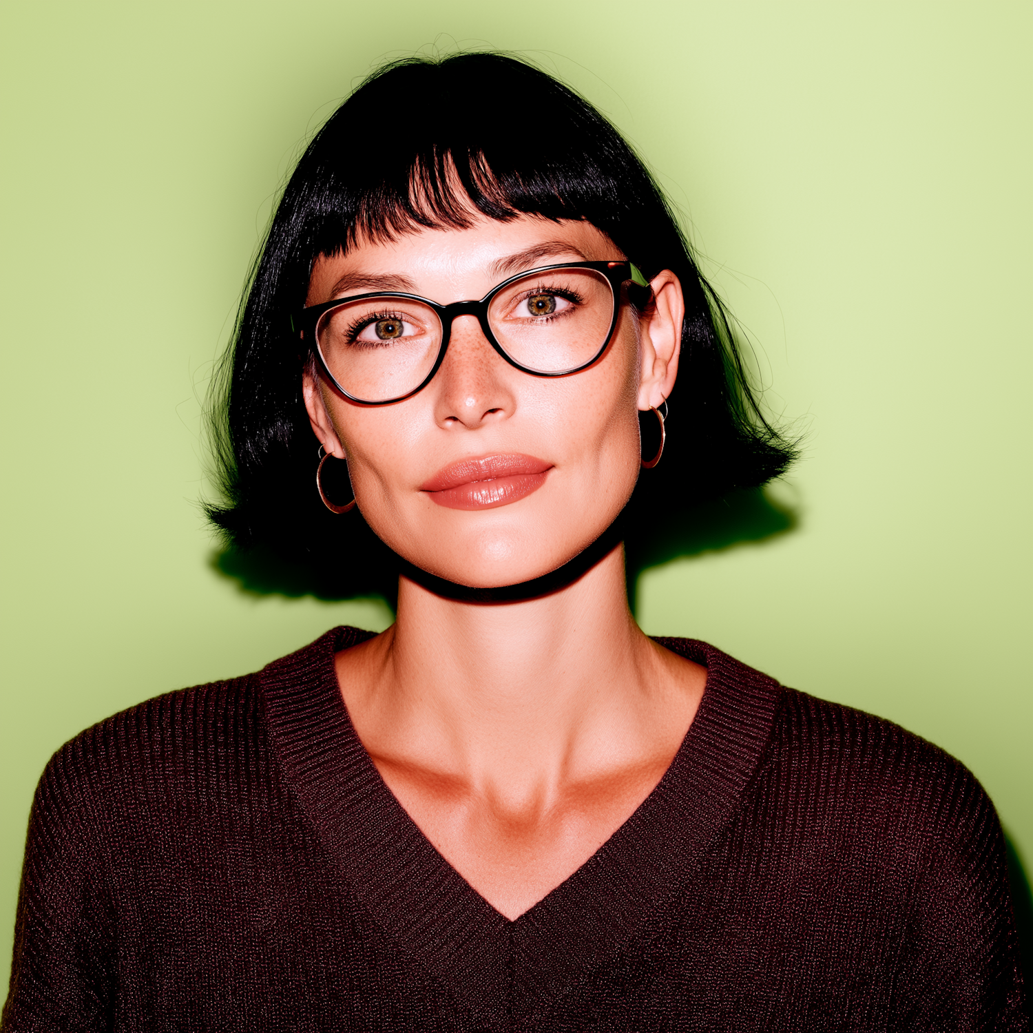 Stylish woman with short black hair, glasses, and hoop earrings against a vibrant green background. Modern and chic look.