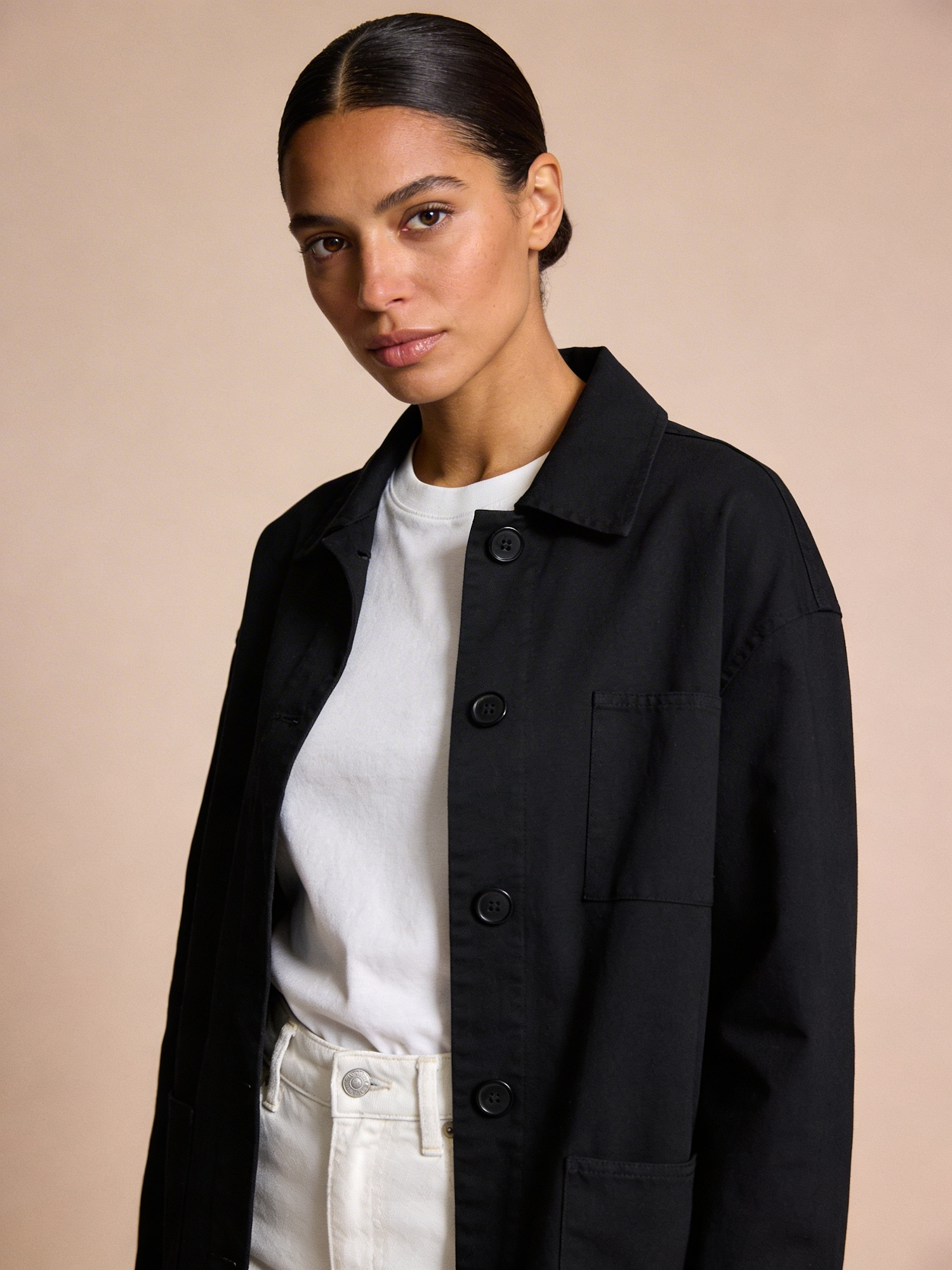 Studio portrait, Scandi-minimal fashion editorial, female early 30s; warm olive skin; sleek low bun with center part. Outfit: black minimalist chore jacket with clean collar and matte buttons over a white crewneck tee, high-waisted white denim (waistline visible), no logos. Framing: chest-up; 3/4 angle. Solid soft greige seamless backdrop. Rembrandt lighting with soft fill; 105 mm macro-sharp; natural skin texture. Expression: composed, confident, eyes to camera.