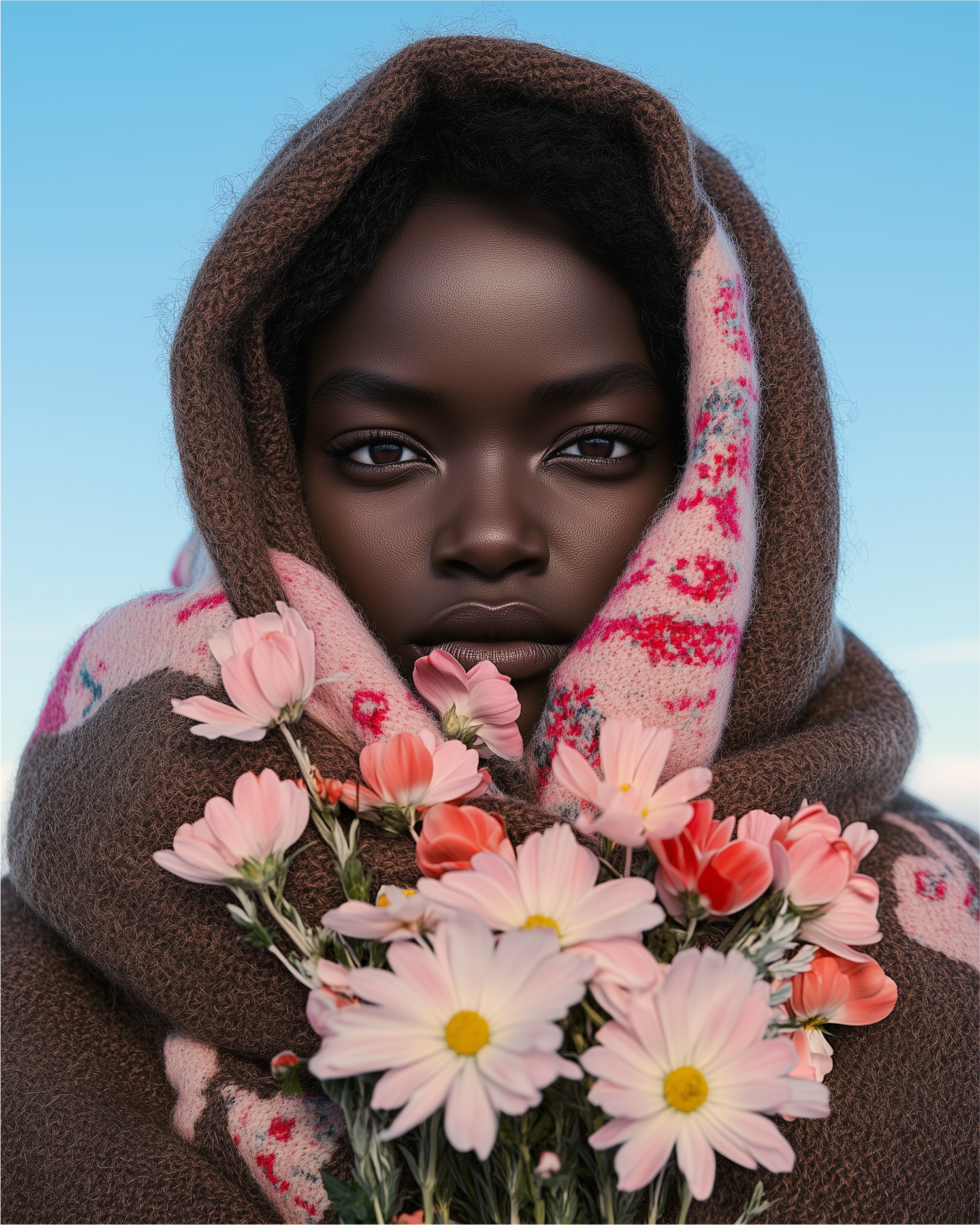 A serene portrait of a young woman wrapped in warm scarves, holding a bouquet of pink flowers against a clear blue sky.