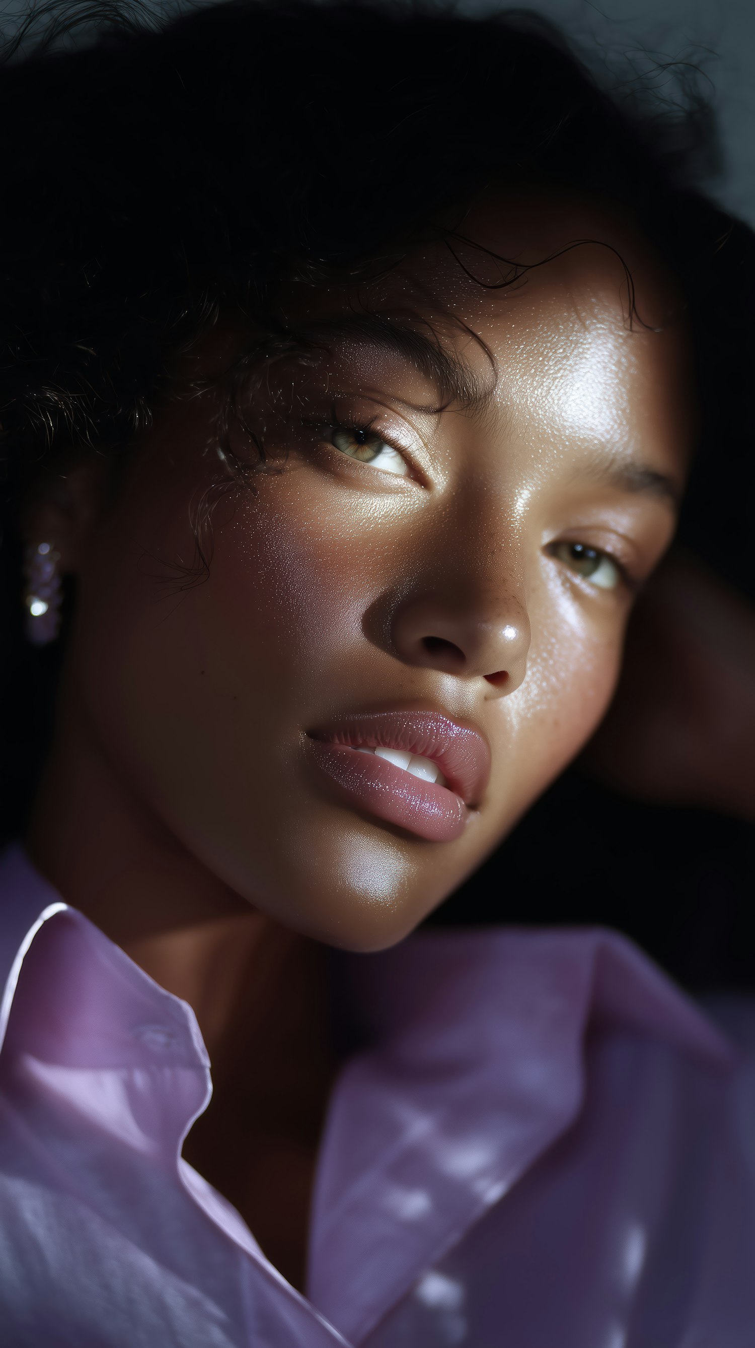 Close-up of a woman with glowing skin, hazel eyes, and curly hair, wearing a lavender shirt. Natural light highlights her captivating features.