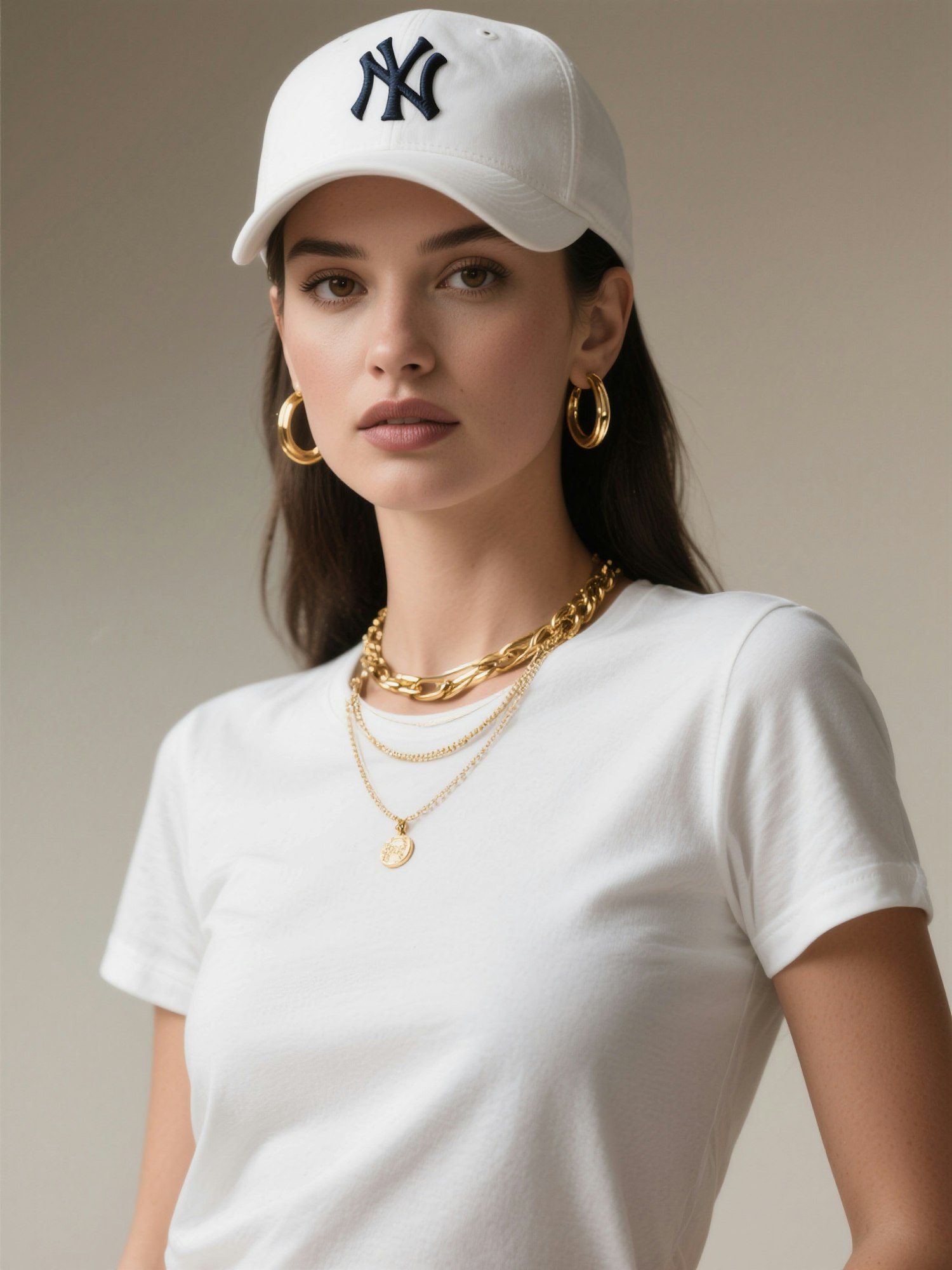 Stylish woman in a white cap and t-shirt, accessorized with gold jewelry, against a neutral background.