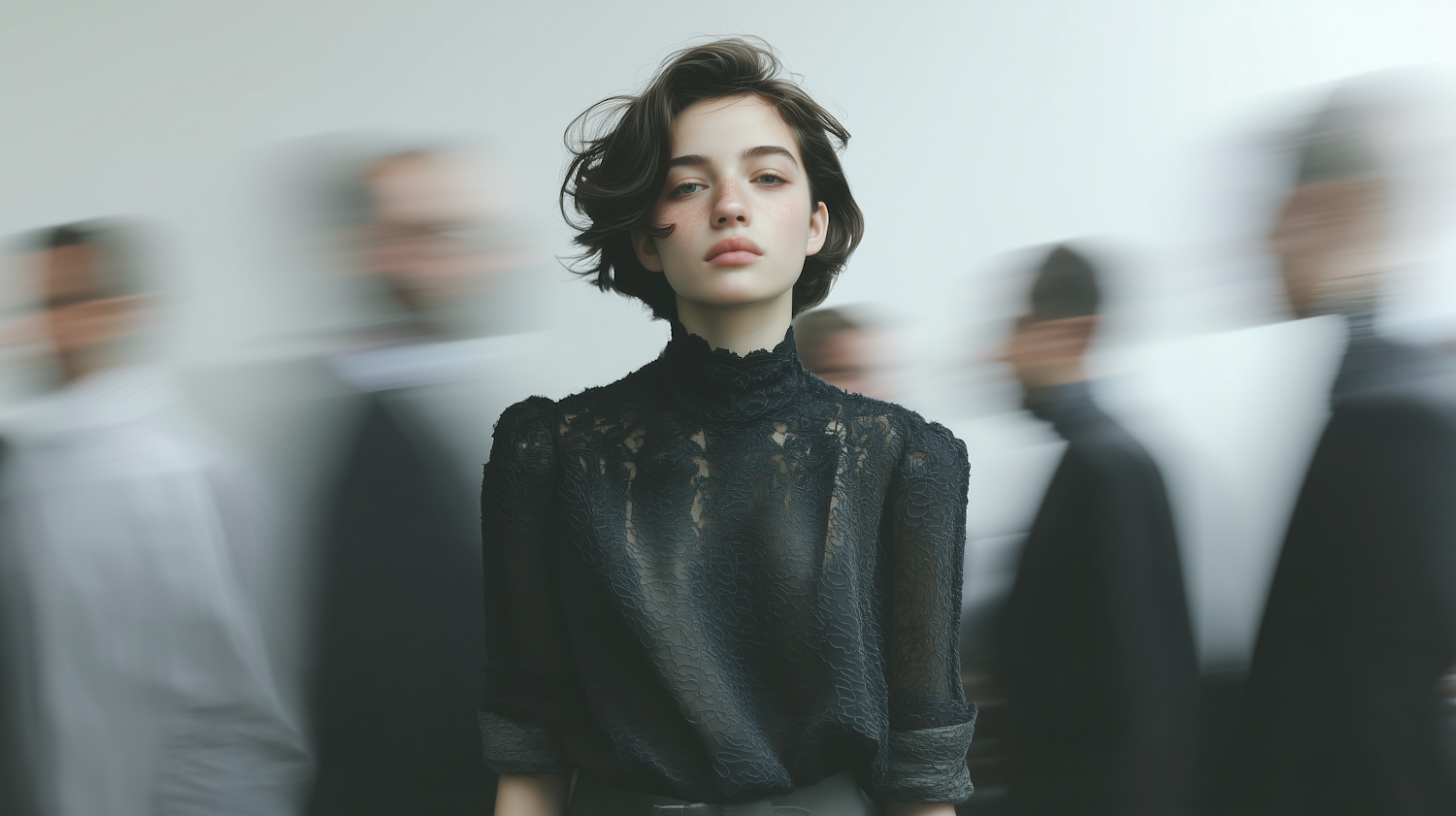 A young woman in a black lace top stands still amidst a blurred crowd, creating a striking contrast of focus and motion.