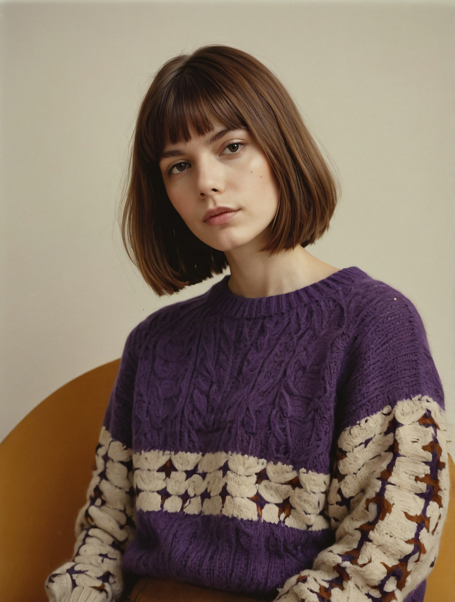 Young woman with a bob haircut in a purple knitted sweater with cream accents, sitting against a neutral background.