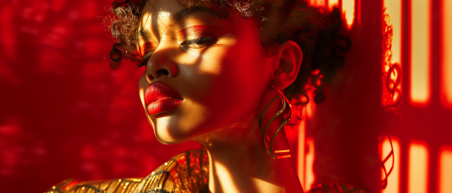 A woman with curly hair and bold red lipstick in dramatic lighting against a red background, wearing large artistic earrings.