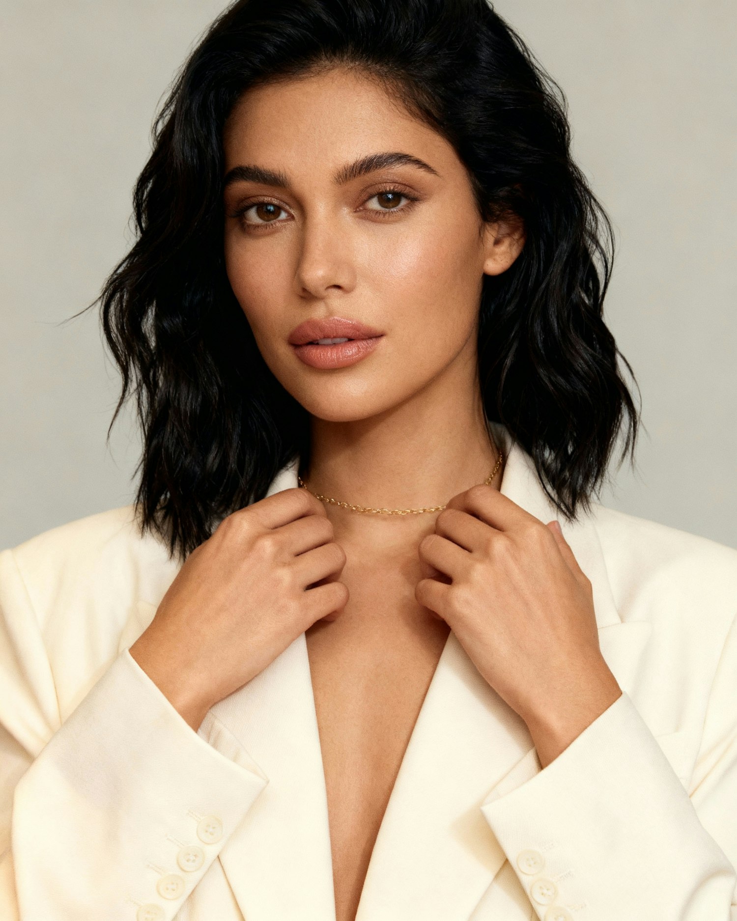 A woman with black wavy hair and a white blazer poses with a gold necklace against a neutral background.