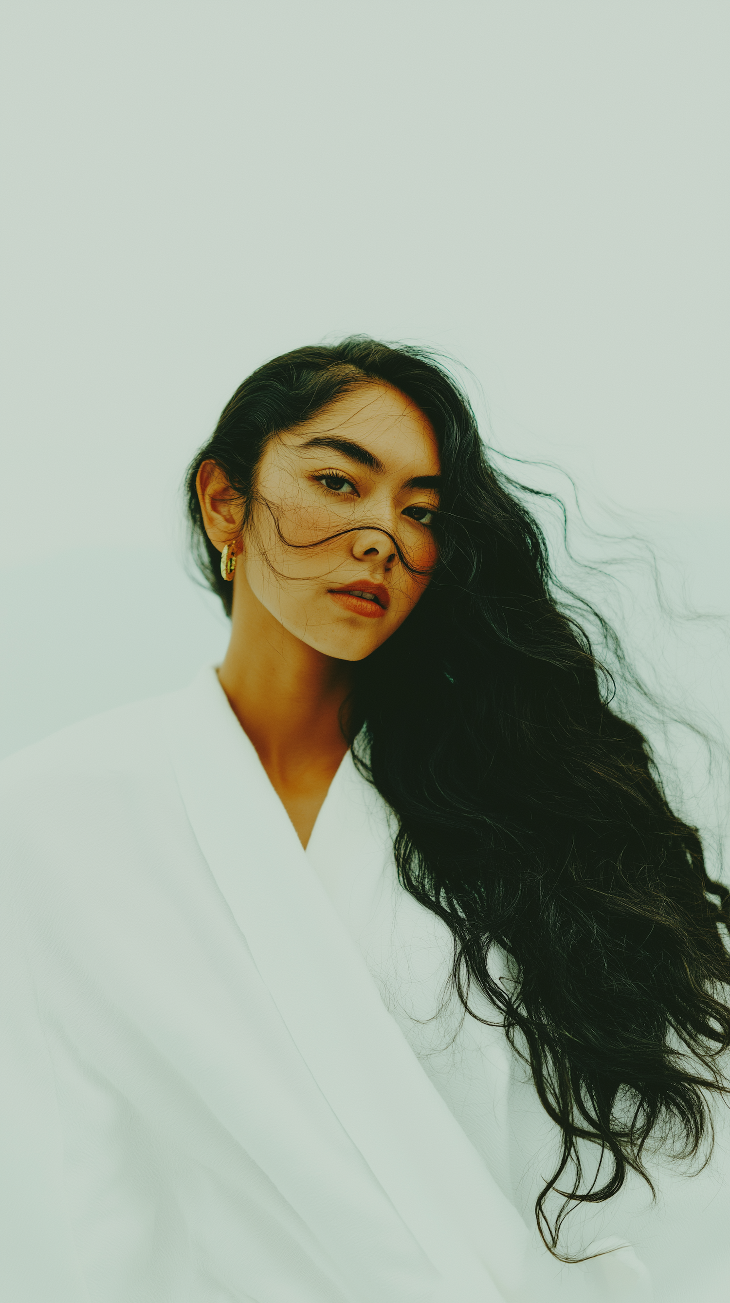 A woman dressed in white with long dark hair, set against a simple, light background for an elegant portrait effect.