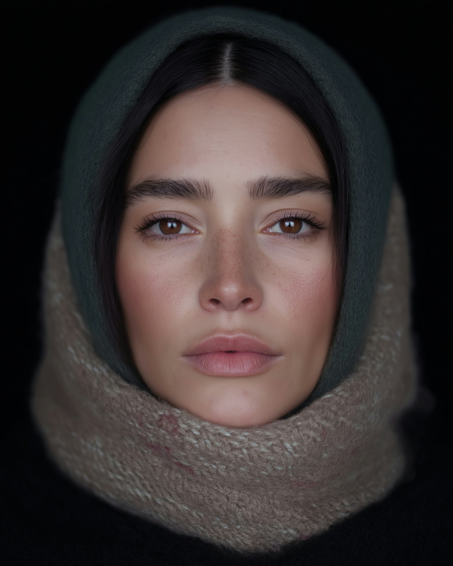 Close-up of a woman with dark brown eyes, a green hood, and a beige scarf, set against a dark background. Neutral expression.