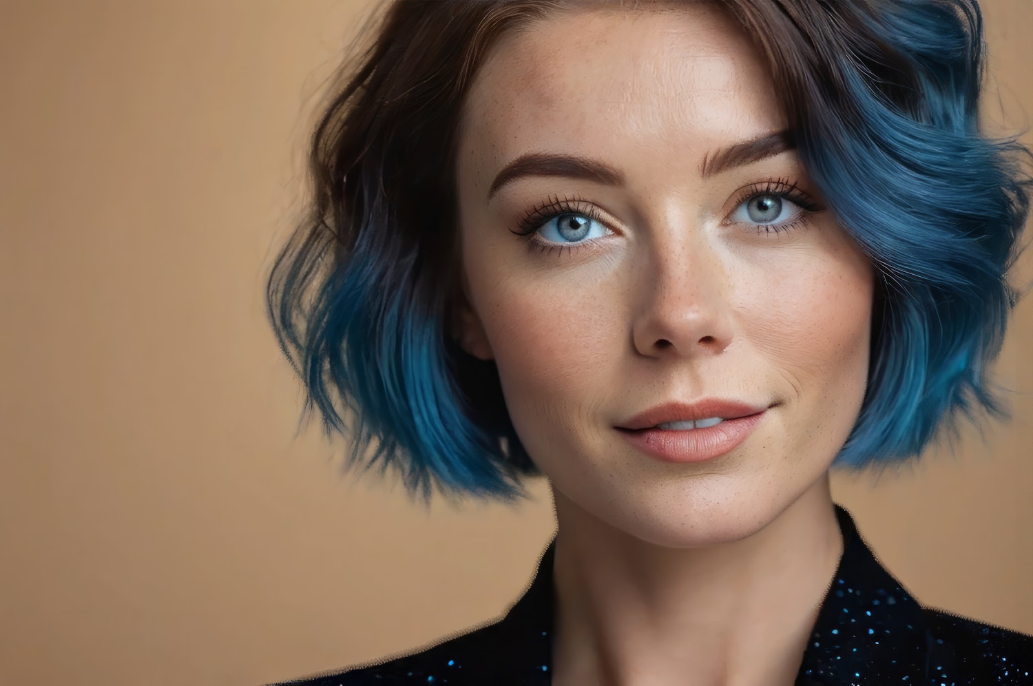 Portrait of a young woman with blue eyes and a chic bob hairstyle, featuring dark brown and blue hues against a neutral background.