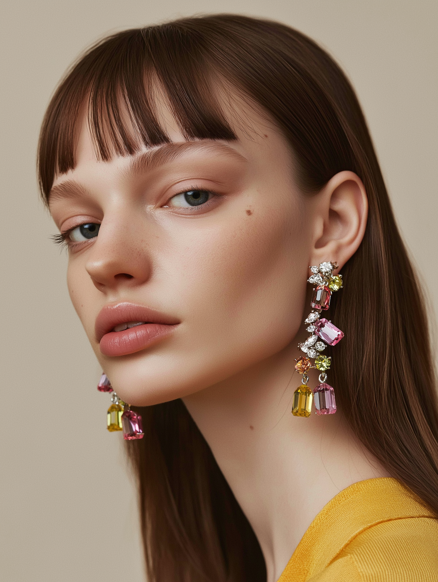 Elegant portrait of a woman with colorful gemstone earrings and a serene expression, set against a neutral background.