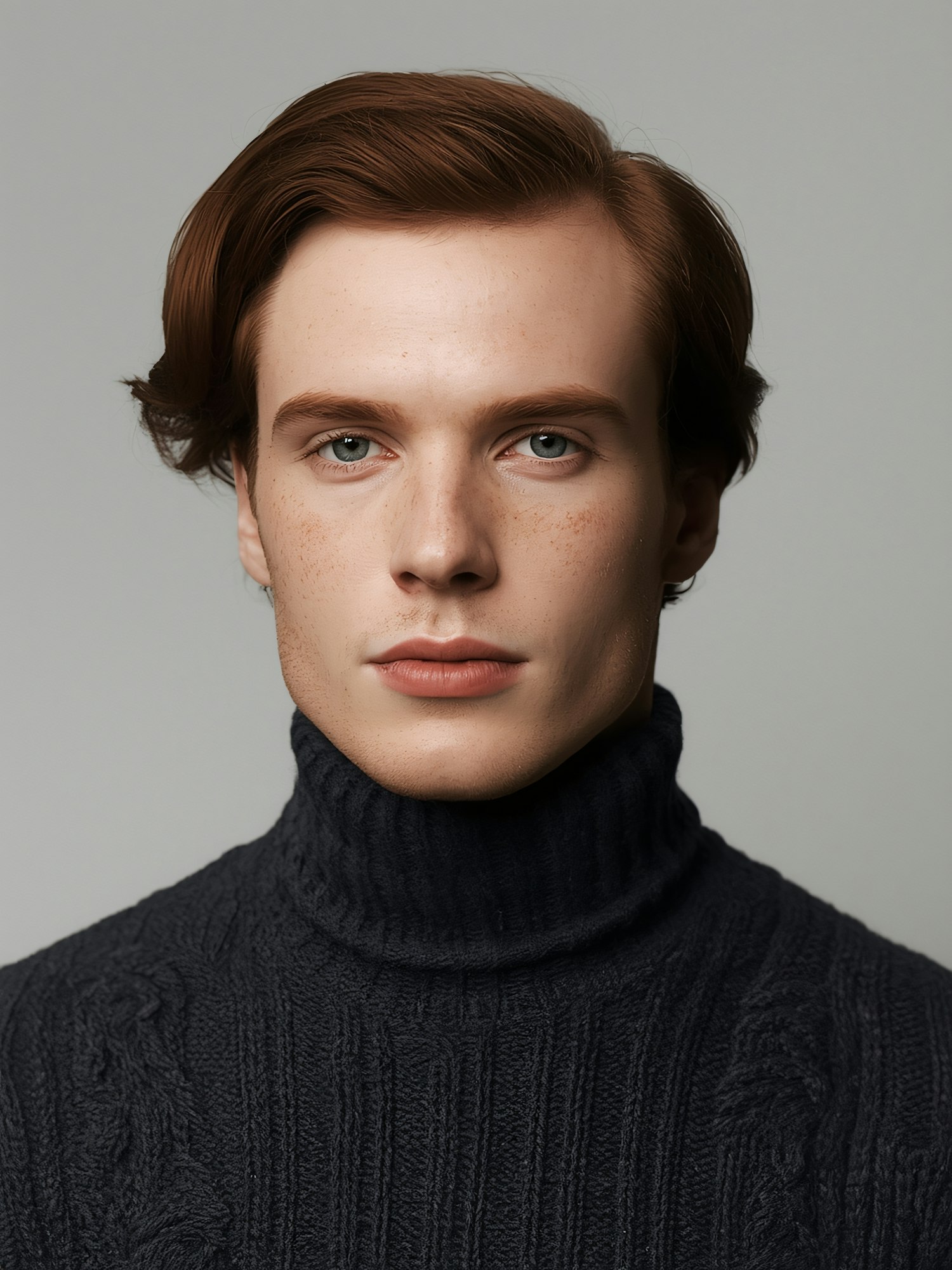 Portrait of a young adult with auburn hair and blue eyes, wearing a dark turtleneck sweater against a neutral gray background.
