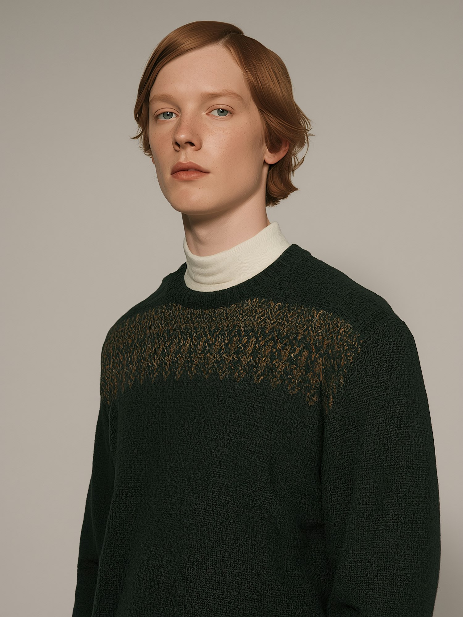 Person in a dark green sweater with a white turtleneck, posing against a neutral background with a calm expression.