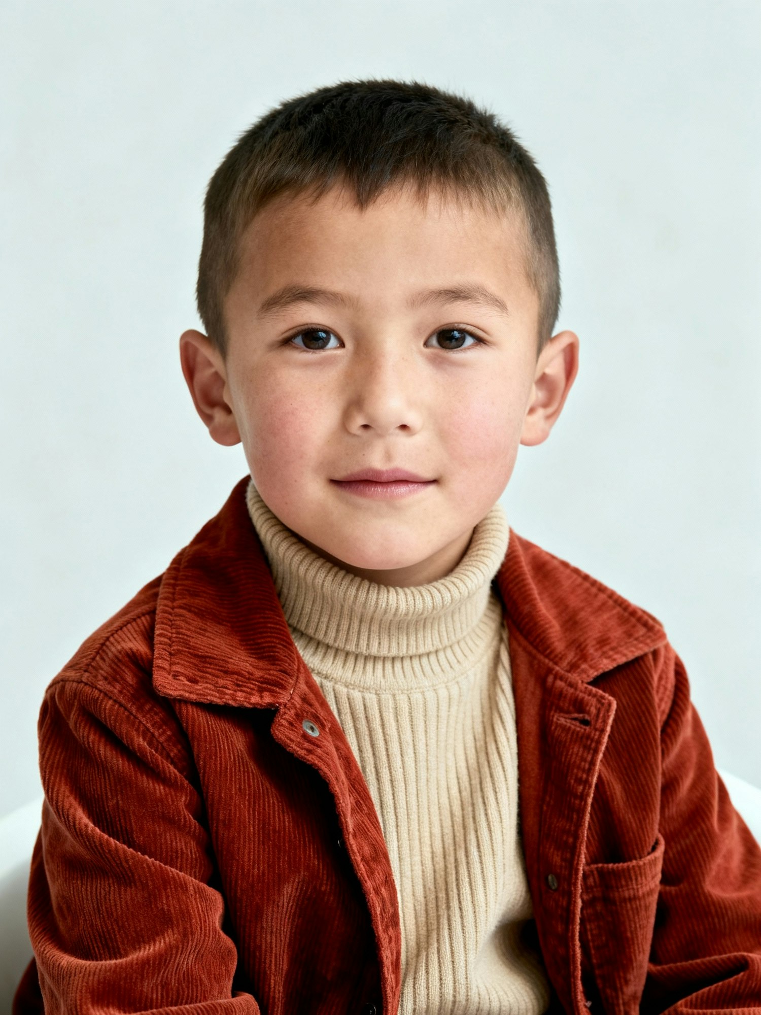 Editorial studio portrait of a Greenlandic child, ~6-year-old boy; calm-bright gaze; cohesive editorial style. Clamshell soft key + gentle rim, 5500 K. Backdrop: pale ice-gray seamless, airy and clean. 105 mm macro-sharp. Skin: fair with cool undertone. Clothing: rust corduroy jacket over oat-beige ribbed turtleneck. Negative: strong shadows, heavy filters, logos, watermark.