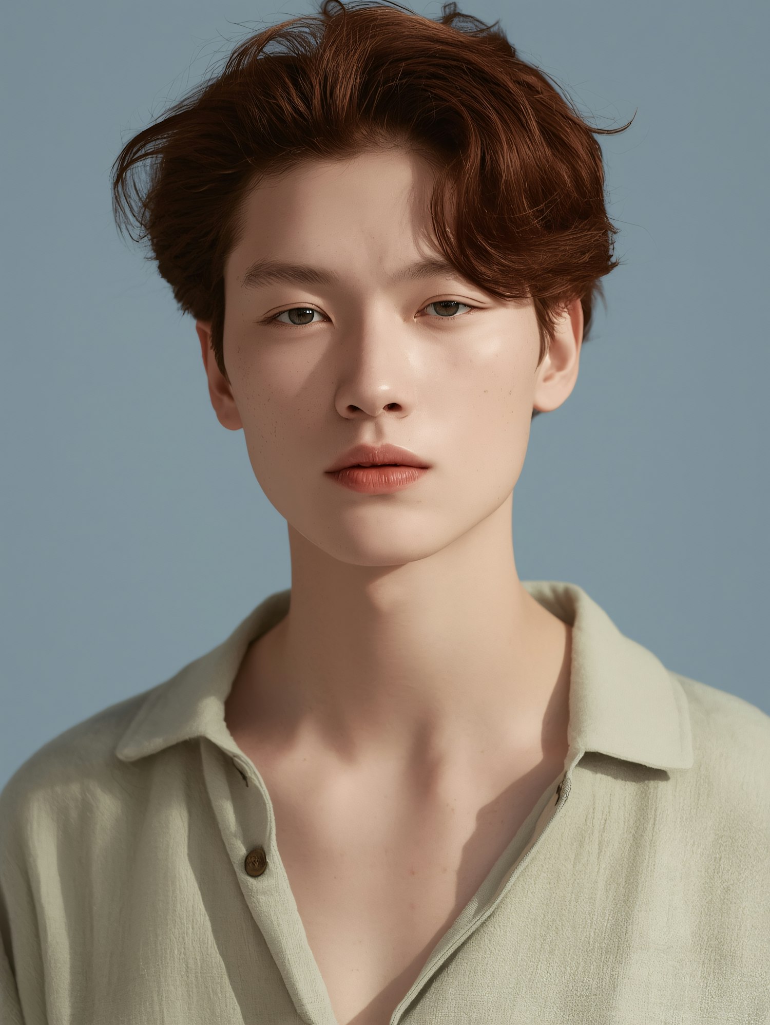 Portrait of a young person with auburn hair and a beige shirt against a light blue background, showcasing a clean and minimalistic style.