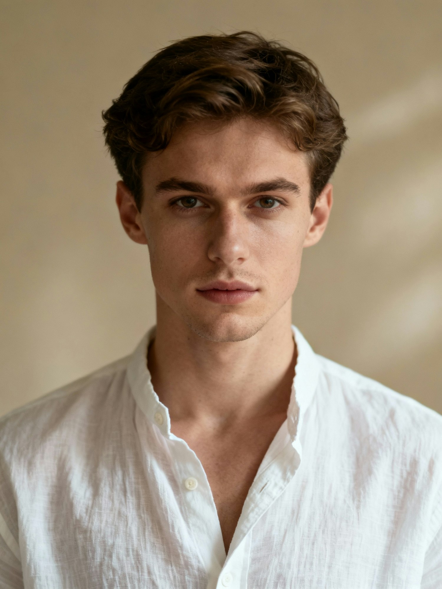 Portrait of a young man with wavy brown hair, green eyes, and a white shirt, set against a softly lit neutral background.