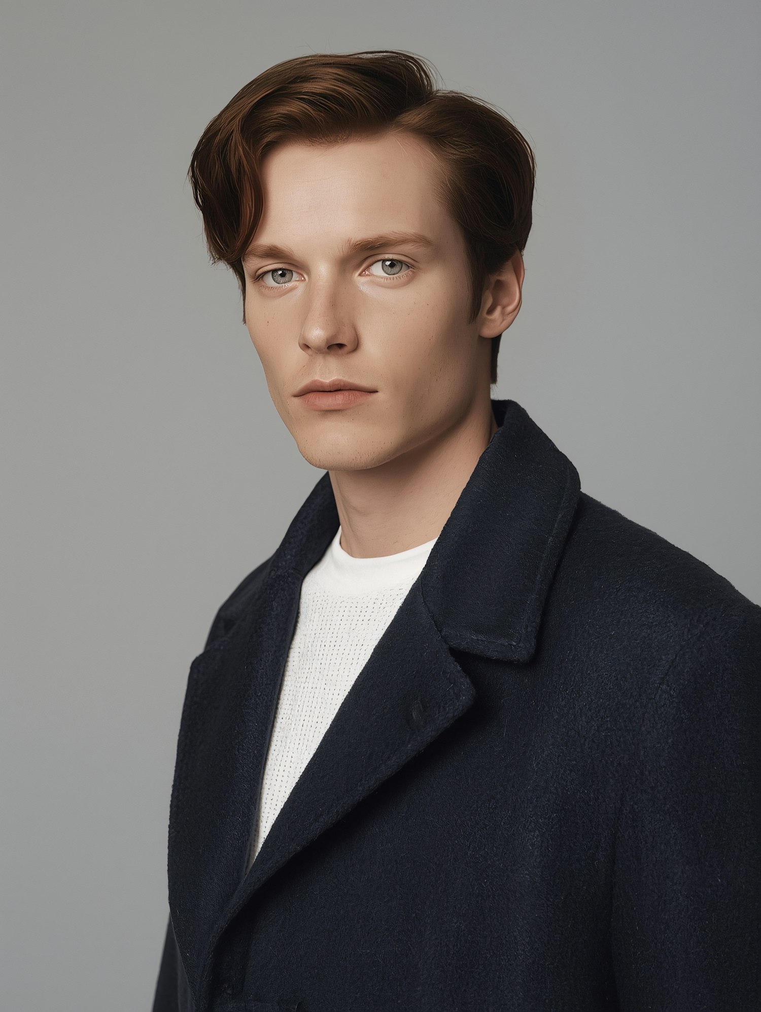Portrait of a young man with light brown hair, wearing a navy coat and white sweater, set against a plain gray background.