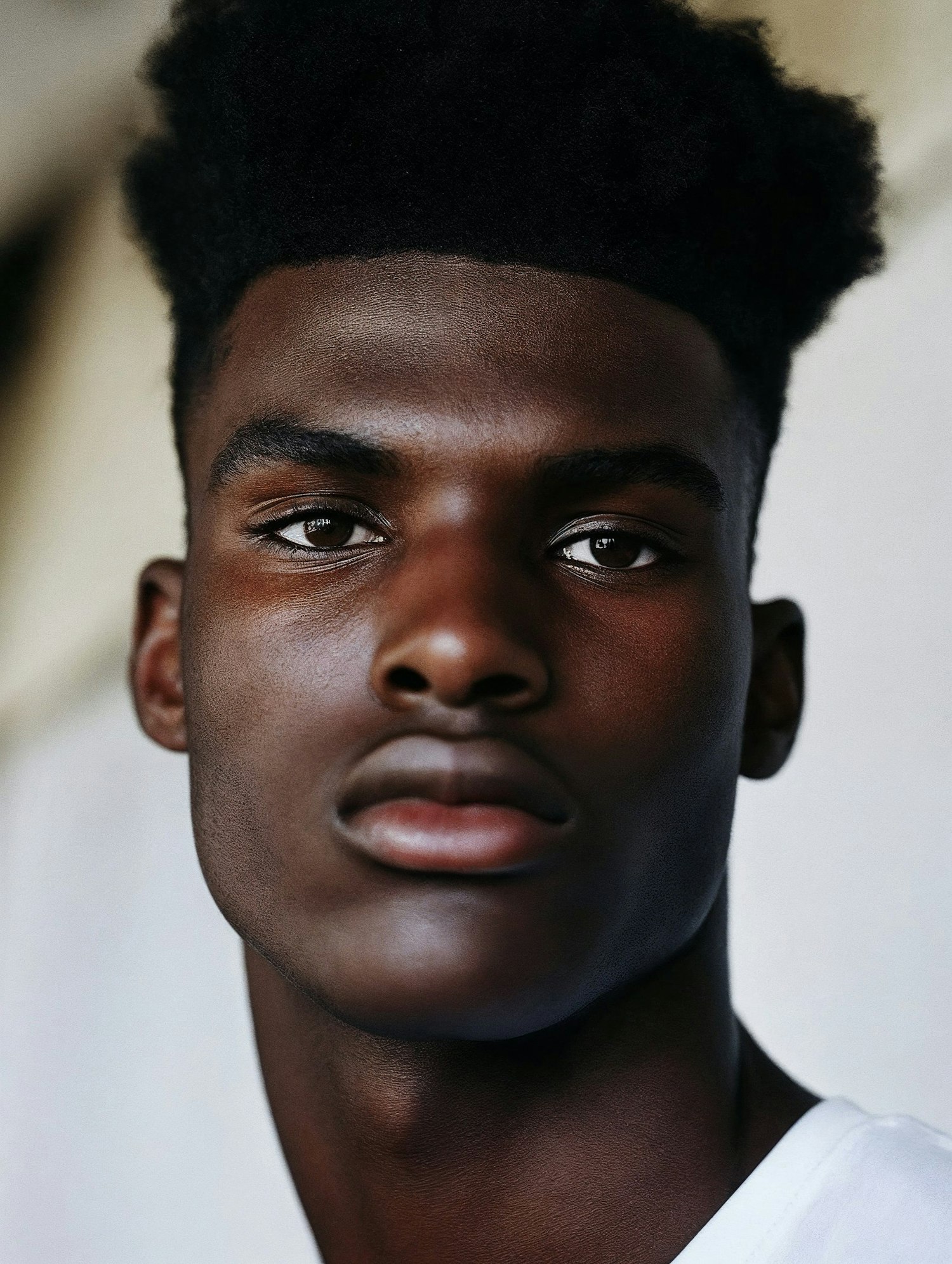 Close-up portrait of a young man with a high afro, deep brown skin, and striking features, wearing a white shirt against a blurred background.