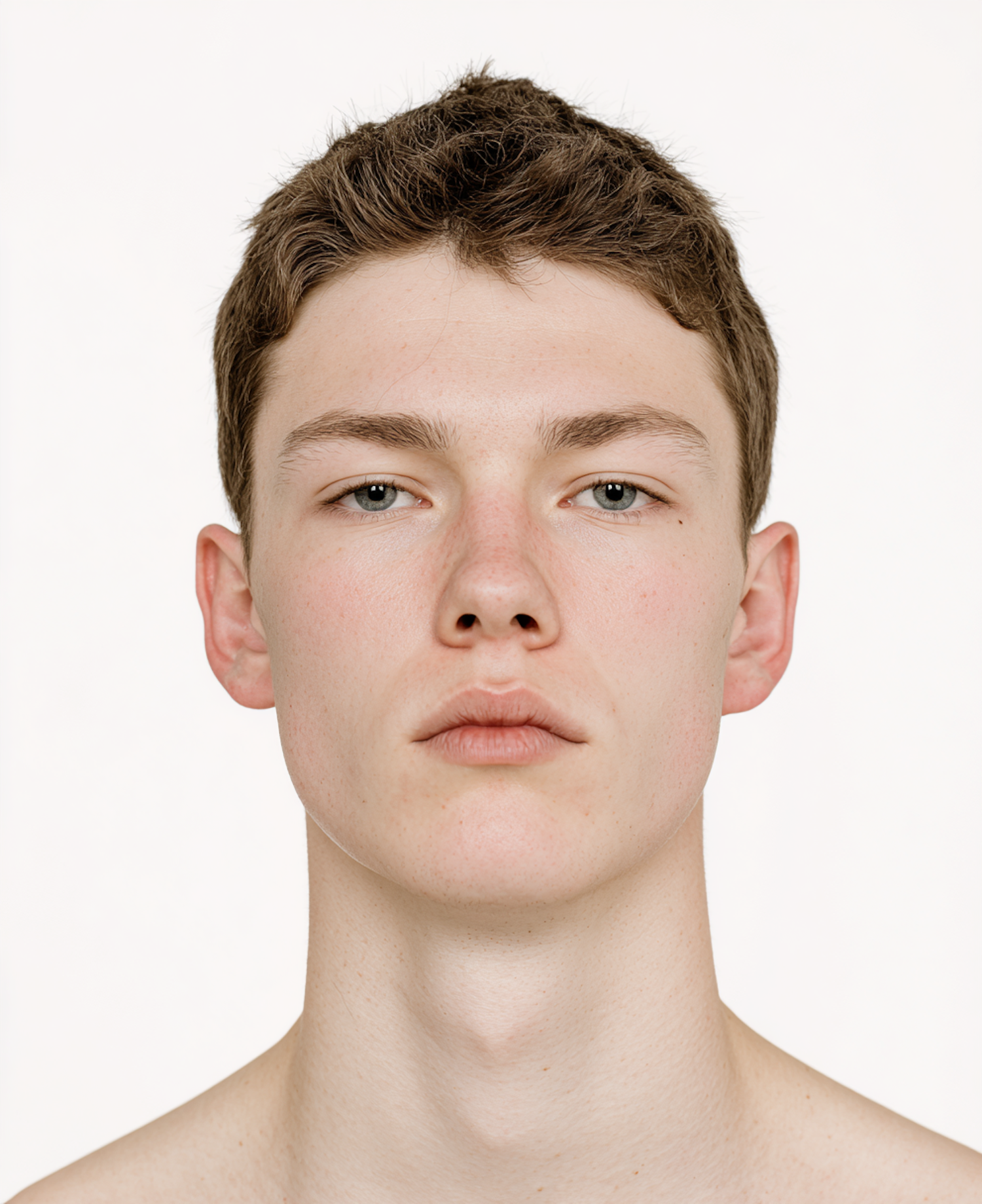 Close-up portrait of a young man with short brown hair and a neutral expression against a plain white background.