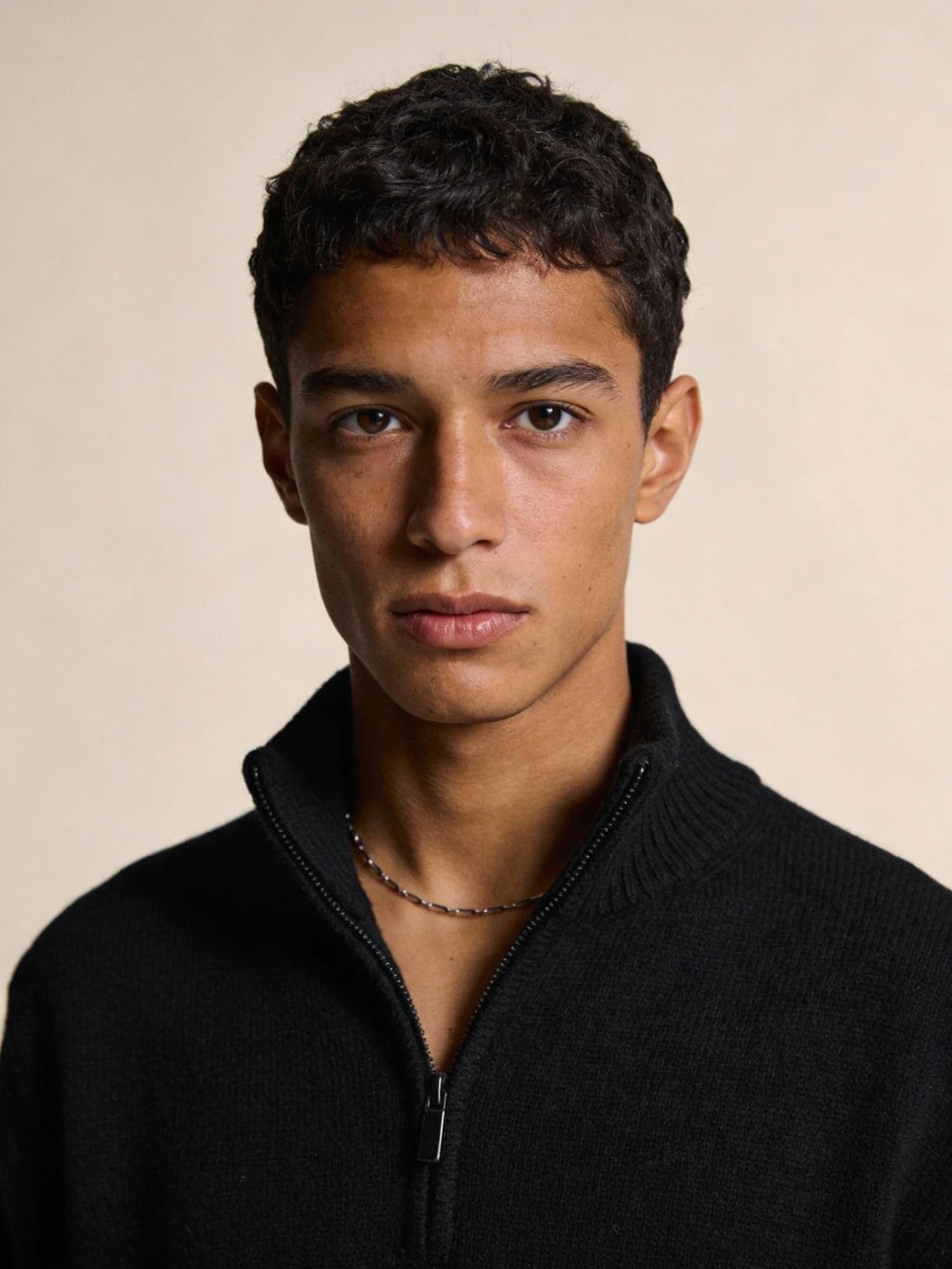Studio portrait, Scandi-minimal fashion editorial, male mid 20s; medium tan skin, warm undertone; short textured hair. Outfit: black zip-neck knit (zip halfway, minimal hardware), no logos; thin chain. Solid cool-beige seamless backdrop. Rembrandt lighting with soft fill; 105 mm macro-sharp. Expression: relaxed, confident, eyes to camera.