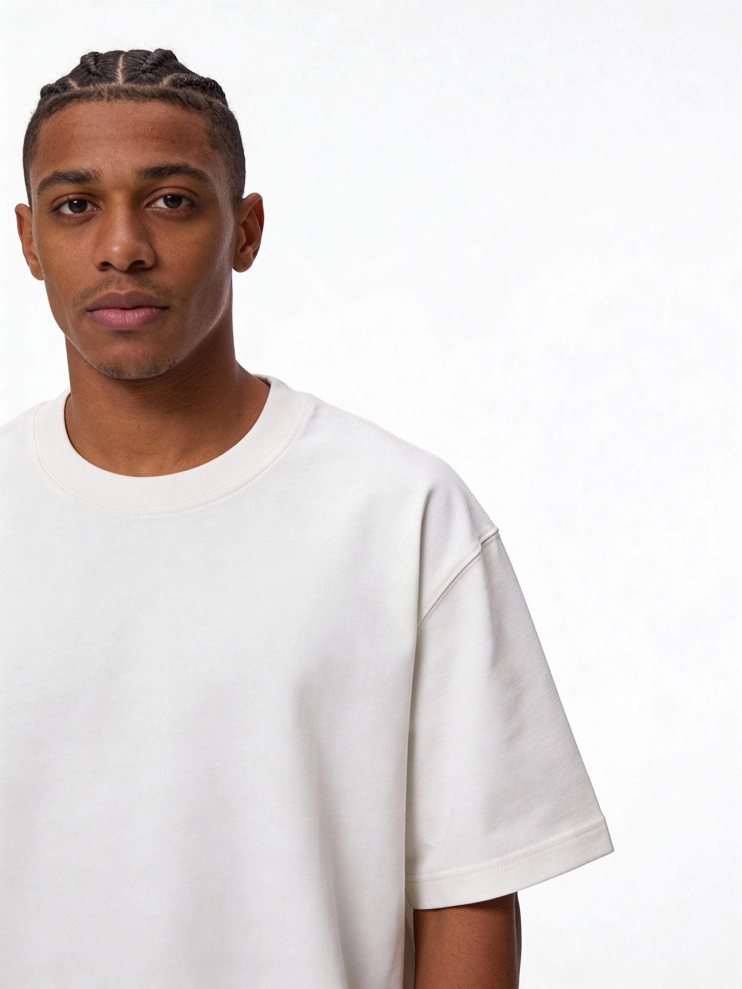 A young man with braided hair and a white t-shirt stands against a clean white background, looking directly at the camera.