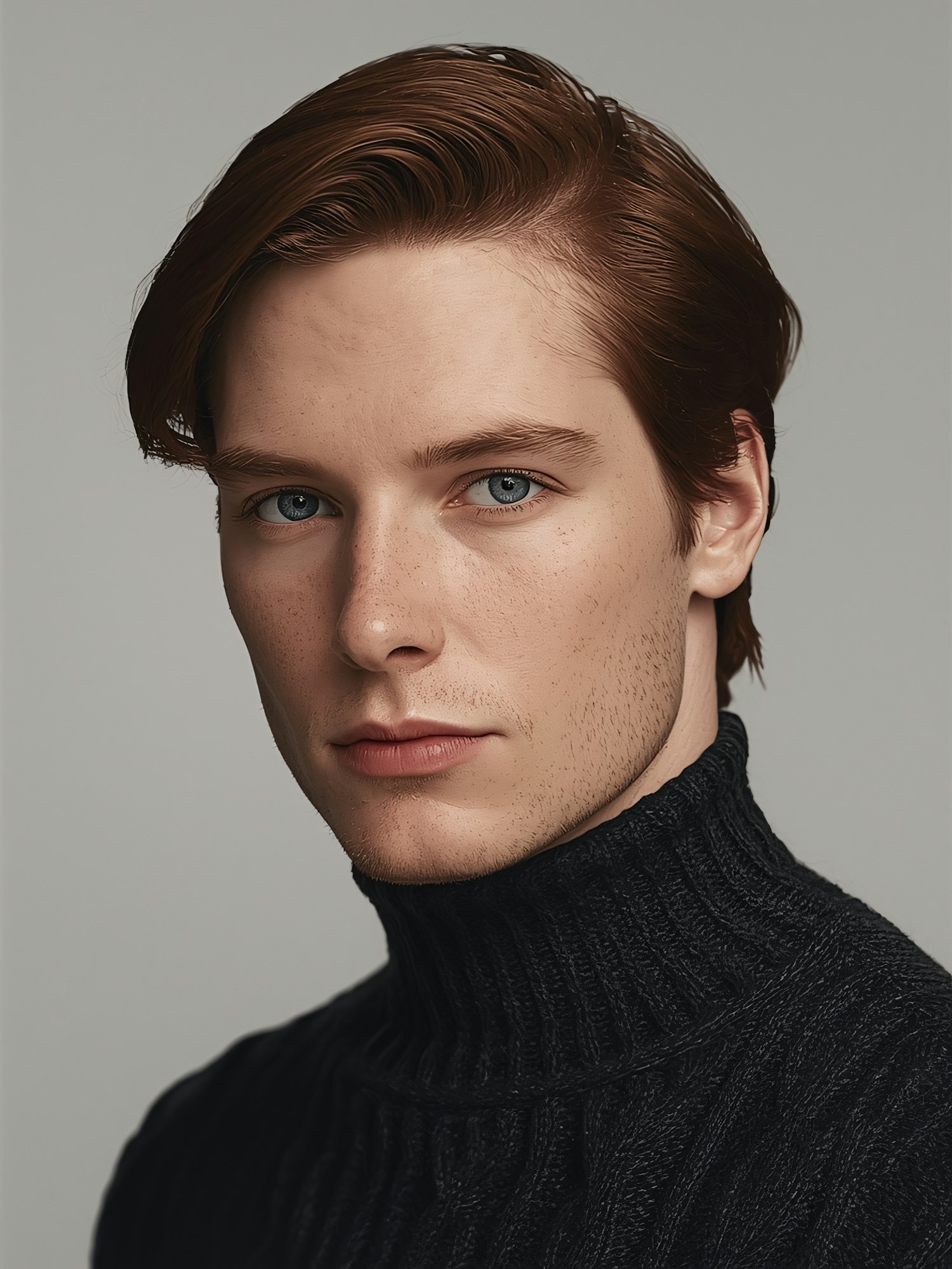 Close-up portrait of a young man with auburn hair, blue eyes, and a black turtleneck against a neutral gray background.