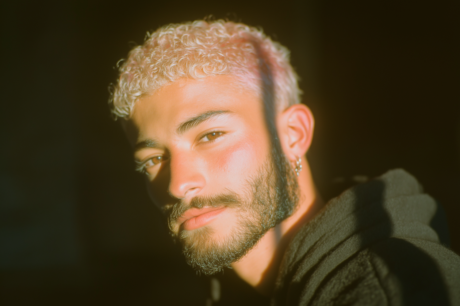 Close-up portrait of a young man with curly blonde hair, a beard, and a dark hoodie, illuminated by warm lighting against a dark background.