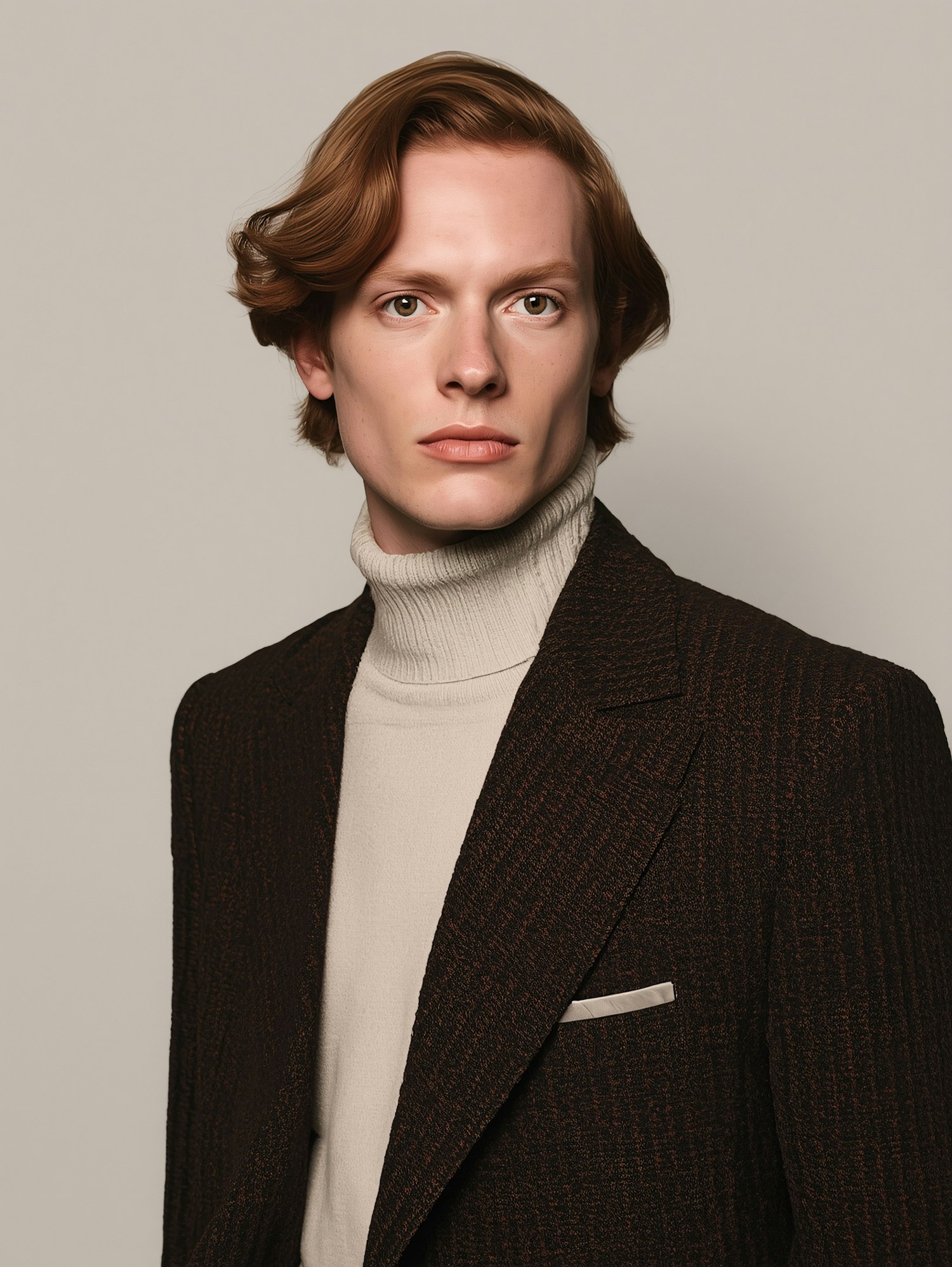 Stylish portrait of a man in a dark blazer and beige turtleneck, set against a neutral gray background.