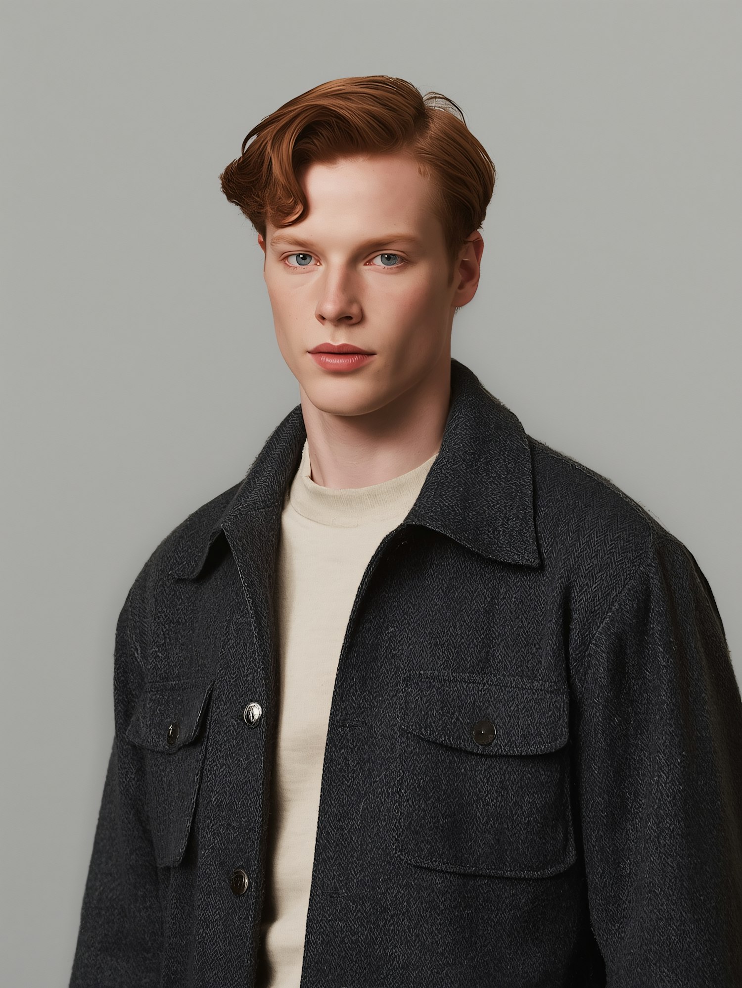 Portrait of a young man with red hair, blue eyes, and a dark gray jacket against a neutral gray background.