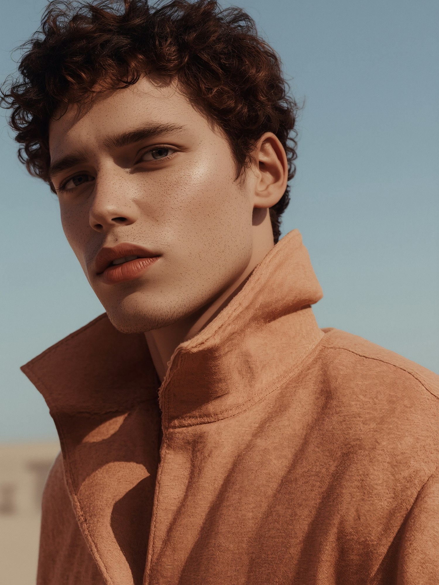 Close-up of a young man with curly brown hair and a high-collared jacket, set against a clear blue sky. Natural and warm tones.