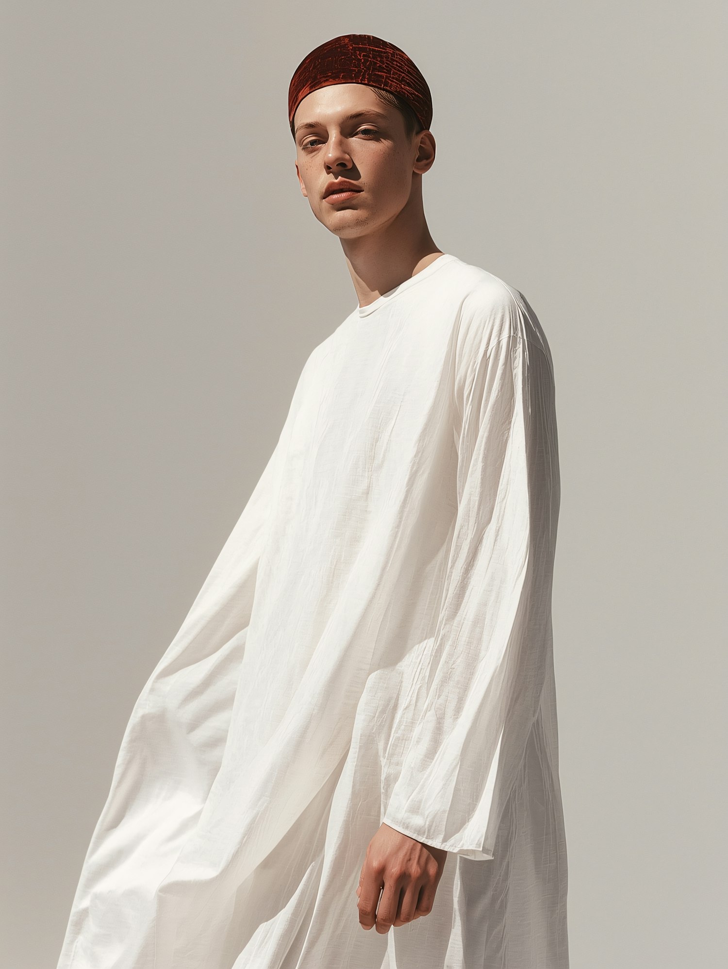 Minimalist portrait of a man in a flowing white outfit and red cap, set against a neutral background with soft lighting.