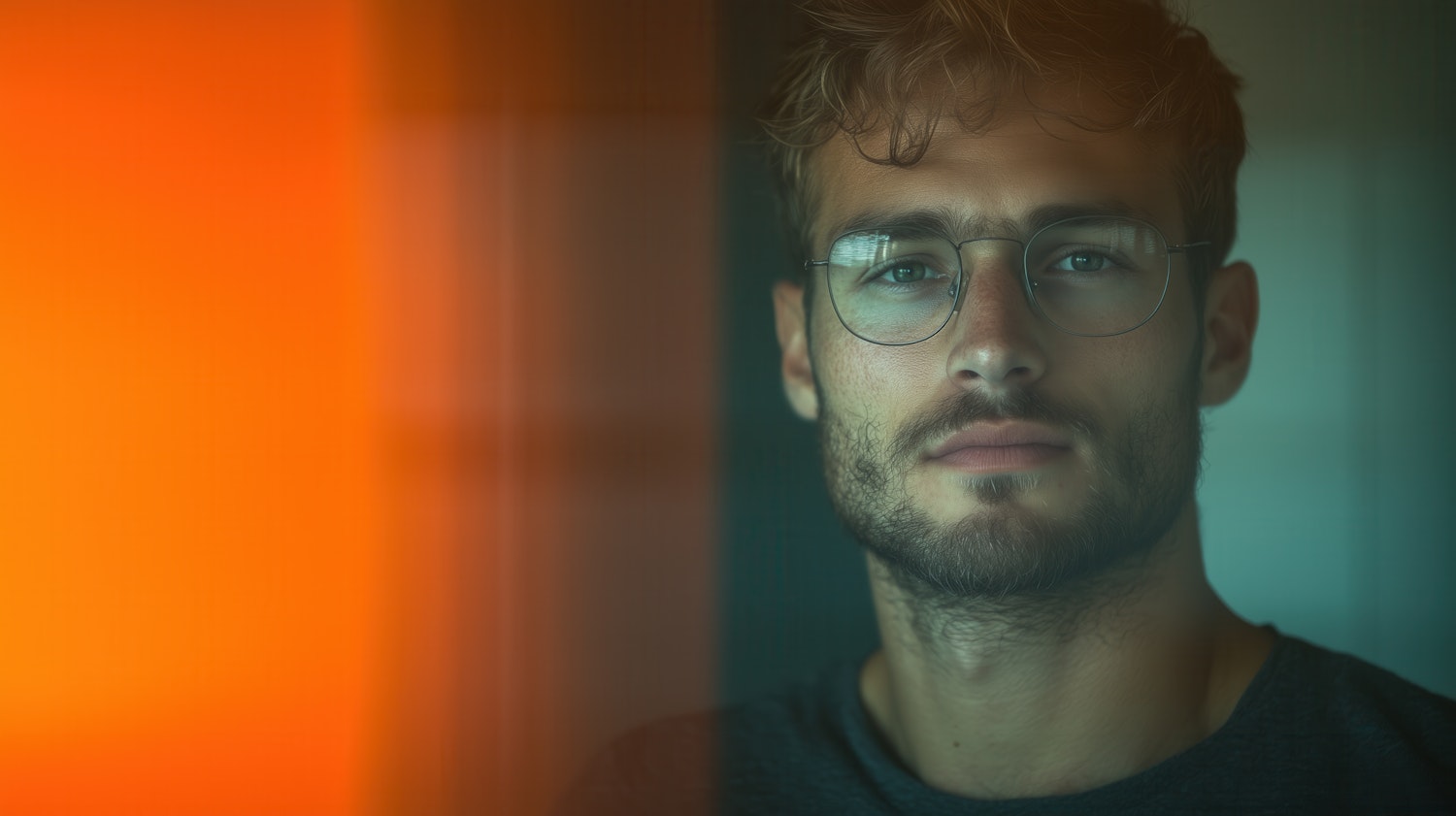 Close-up of a young man with glasses, light brown hair, and a short beard, set against a warm orange and cool-toned gradient background.