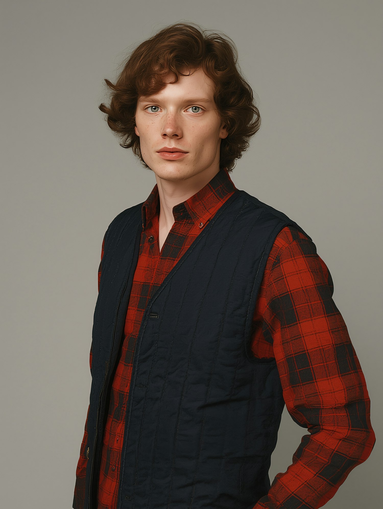 Young man in a red plaid shirt and navy vest, with curly brown hair and a neutral expression, against a light gray background.